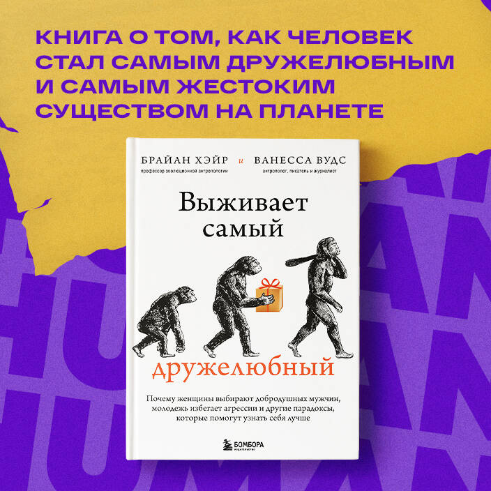 «Пожалуй, ни одна народная теория о человеческой природе не принесла так много вреда - или не была более ошибочной, - чем "выживание самого приспособленного"». Антрополог и доктор наук Брайан Хэйр сделал важное открытие в науке: самая выгодная стратегия выживания - дружелюбие. Именно этот механизм позволил Homo Sapiens остаться жить и процветать, волкам полюбить людей, бонобо создать райское место и советскому ученому сделать мировой прорыв в генетике. Но у этого есть обратная сторона - мы жестоки к тем, кого не считаем своими друзьями. Человек способен дегуманизировать врагов и уничтожать целые народы. Все это из-за одного и того же механизма, который развил в нас эмпатию и милосердие. Брайан Хэйр побывал в Новосибирске, где познакомился с одомашненными лисами, и у реки Конго, где исследовал обезьян. Он заглянул в самые темные уголки человеческой истории: геноцид, принудительная стерилизация, шовинизм, расизм. Это исследование объясняет войны прошлого, расцвет и падение империй и современную политику, а главное, почему нам так важно иметь общие интересы и помогать близким. ИЗ ЭТОЙ КНИГИ ВЫ УЗНАЕТЕ: - как человек стал домашним; - почему лучше дружить, чем воевать; - с помощью чего человек может угадать мысли другого; - почему люди хотят быть как все и так страшно выделяться в обществе; - как собака стала лучшим другом человека. ОБ АВТОРАХ Брайан Хэйр - доктор наук, глава центра когнитивных нейронаук, профессор эволюционной антропологии, психологии и нейронаук в Университете Дьюка. Опубликовал более ста научных работ в ведущих научных журналах. Его исследования регулярно получают признание на мировом уровне. Ванесса Вудс - научный сотрудник эволюционной антропологии в Университете Дьюка. Отмеченная наградами писатель научно-популярных книг для взрослых и детей.