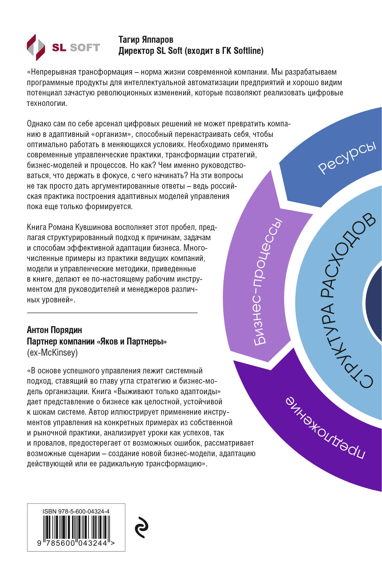«ВЫЖИВАЮТ ТОЛЬКО АДАПТОИДЫ» - руководство по созданию работающей бизнес-модели компании и ее постоянной трансформации в эпоху постоянных изменений. Книга дает представление о бизнесе как о целостной системе, фокусирует внимание на значимости бизнес-модели, понимании смысла составляющих ее элементов, при этом удерживая в поле зрения экономическую эффективность и устойчивость денежной позиции. Автор, обладая 20-летним опытом управления бизнесом в реальном секторе экономики страны, рассказывает о техниках адаптации бизнес-моделей на конкретных примерах из собственной и рыночной практики, анализирует уроки успехов и провалов, а также формирует простой, но в то же время эффективный подход к описанию того, как работает бизнес и за счет чего он получает прибыль. Книга обращена к широкому бизнес-сообществу - основателям компаний, руководителям высшего и среднего звена, слушателям бизнес-школ, а также всем, кто только планирует запустить собственный бизнес или ищет новые возможности для развития.| Издательство | ООО "Издательство "Эксмо" |