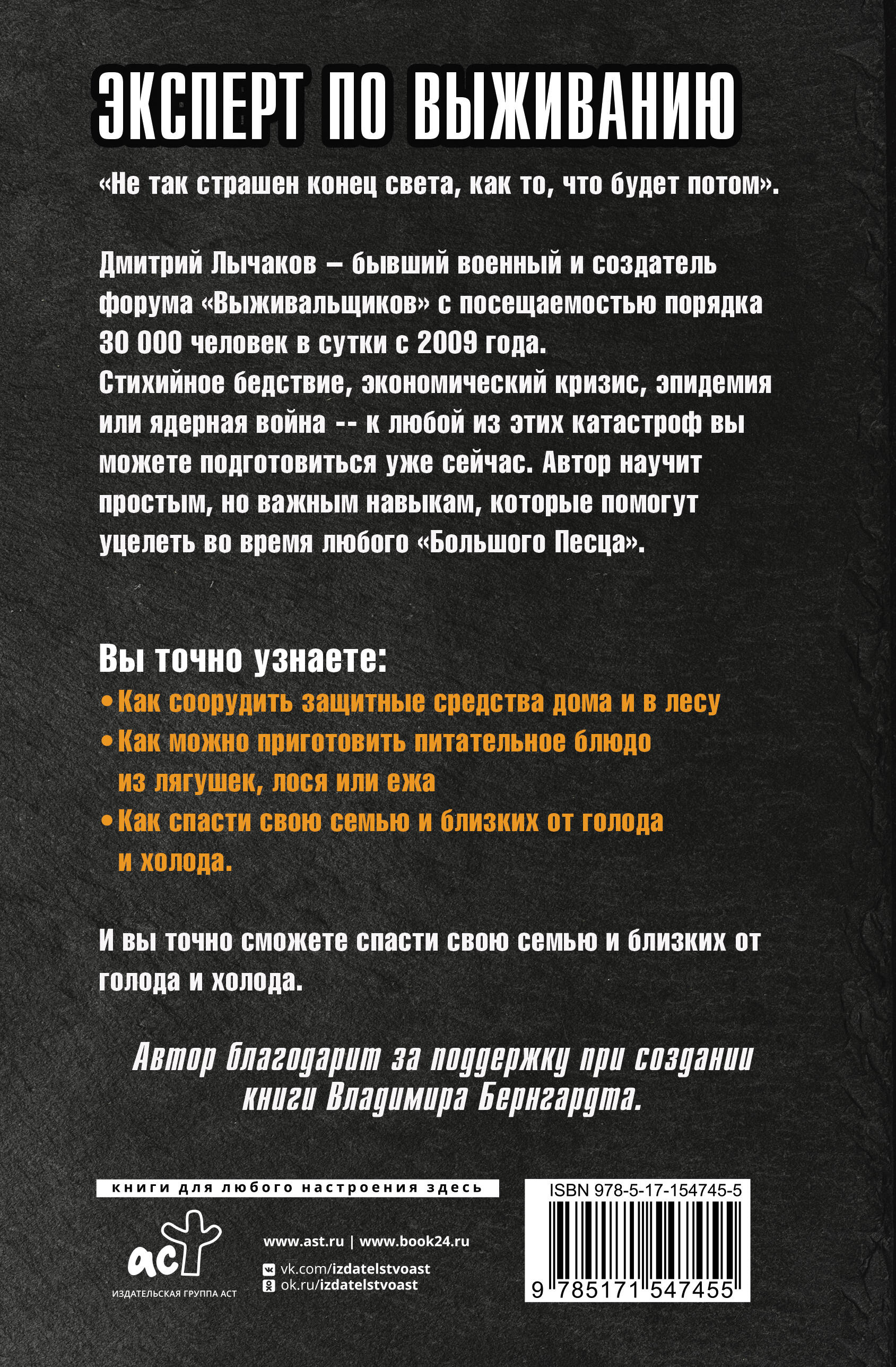 "Не так страшен конец света, как то, что будет потом". Дмитрий Лычаков - бывший военный и создатель форума "Выживальщиков" c посещаемостью порядка 30 000 человек в сутки с 2009 года. Стихийное бедствие, экономический кризис, эпидемия или ядерная война -- к любой из этих катастроф вы можете подготовиться уже сейчас. Автор научит простым, но важным навыкам, которые помогут уцелеть во время любого "Большого Песца". Вы точно узнаете: • Как соорудить защитные средства дома и в лесу • Как можно приготовить питательное блюдо из лягушек, лося или ежа • Как спасти свою семью и близких от голода и холода.| Издательство | ИЗДАТЕЛЬСТВО "АСТ" |
