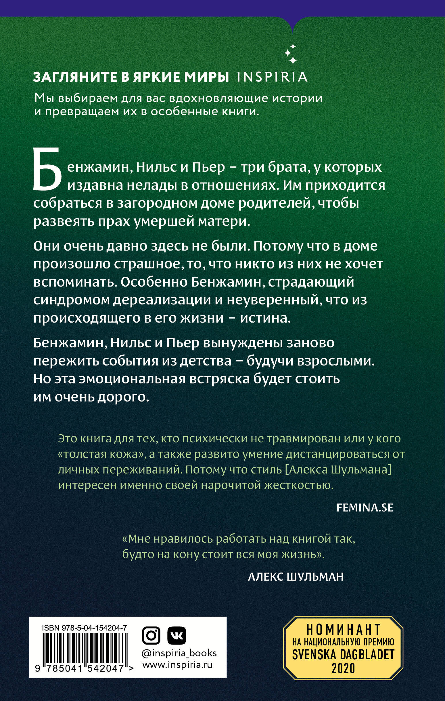 «Это книга для тех, кто психически не травмирован или у кого «толстая кожа», а также развито умение дистанцироваться от личных переживаний. Потому что стиль [Алекса Шульмана] интересен именно своей нарочитой жесткостью». - femina.se Алекс Шульман - номинант на национальную премию Svenska Dagbladet 2020. Бенжамин, Нильс и Пьер - три брата, у которых издавна нелады в отношениях. Однако им приходится собраться в загородном доме родителей, чтобы развеять прах умершей матери. Братья не посещали это место очень давно. Потому что никто из них не хотел бы повторить детские годы. Особенно Бенжамин, страдающий синдромом дереализации и не уверенный, что в его изменчивой жизни - истина. Собравшись вместе, братья вынуждены заново пережить детство и сделать для себя несколько тревожных открытий. «Мне нравилось работать над книгой так, будто на кону стоит вся моя жизнь». - Алекс Шульман| Издательство | ООО "Издательство "Эксмо" |