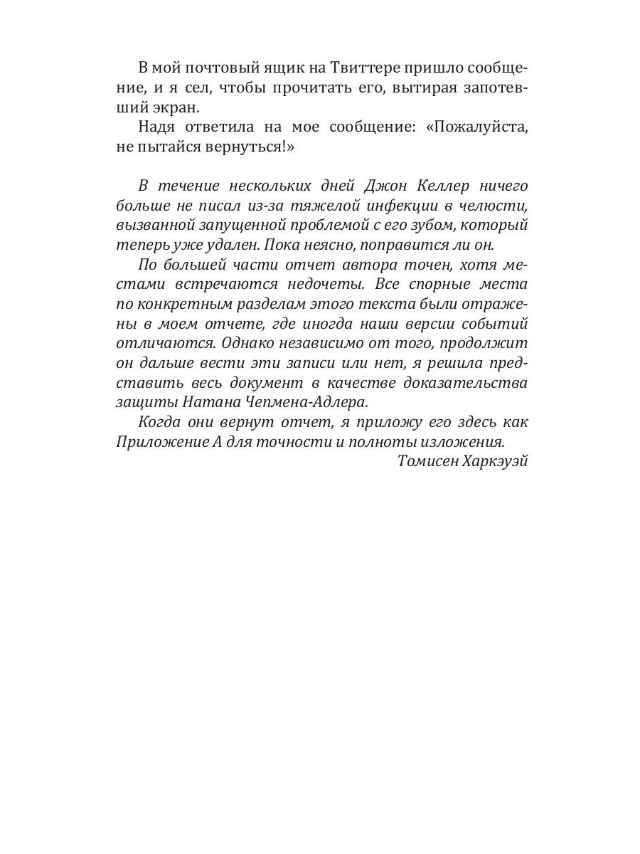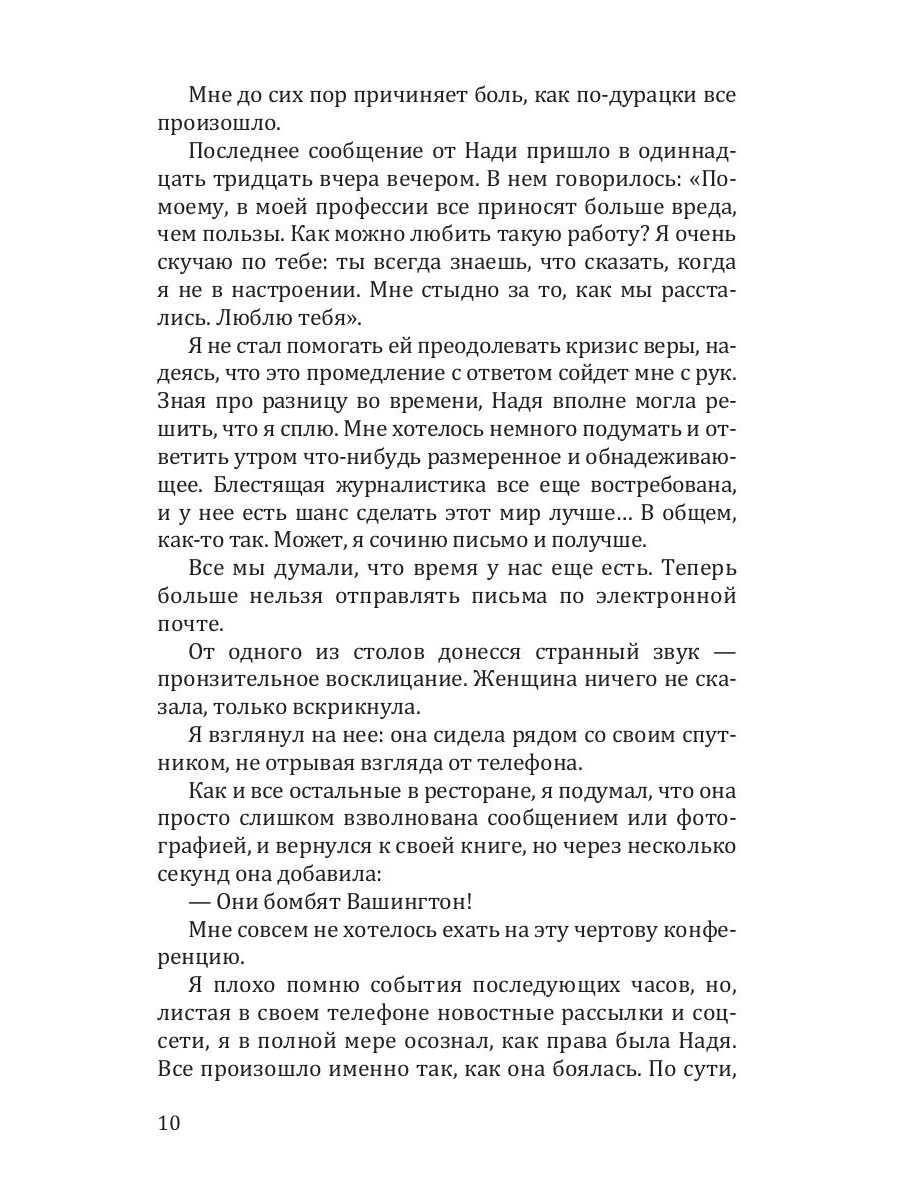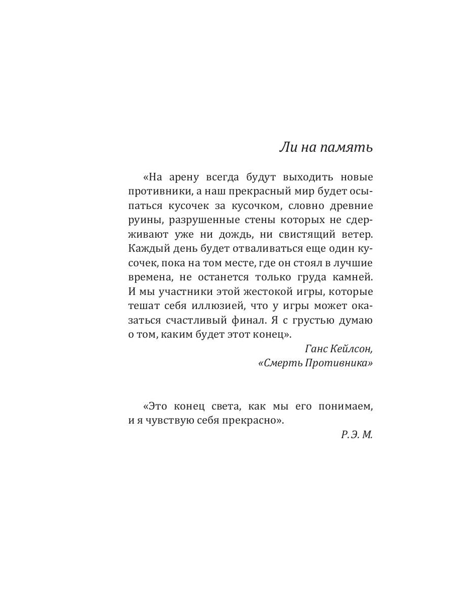 Историк Джон Келлер находился на конференции в одном из отелей Швейцарии, когда ядерное оружие разрушило большую часть мира. Люди охвачены паникой. Но Джон остаётся верным своей профессии и документирует события после катастрофы, составляя хронику современных ему дней. Он тщательно фиксирует свой опыт, а также собирает истории других постояльцев, надеясь, что ему удастся сохранить хотя бы память об исчезающем человечестве. Но у многих из оставшихся в живых есть свои тайны, которыми они не готовы делиться... Джон находит на крыше тело маленькой девочки. Кто из постояльцев убийца? Келлер начинает исследовать огромный отель в надежде найти виновного и ответы на свои вопросы.| Издательство | Рипол Классик |
