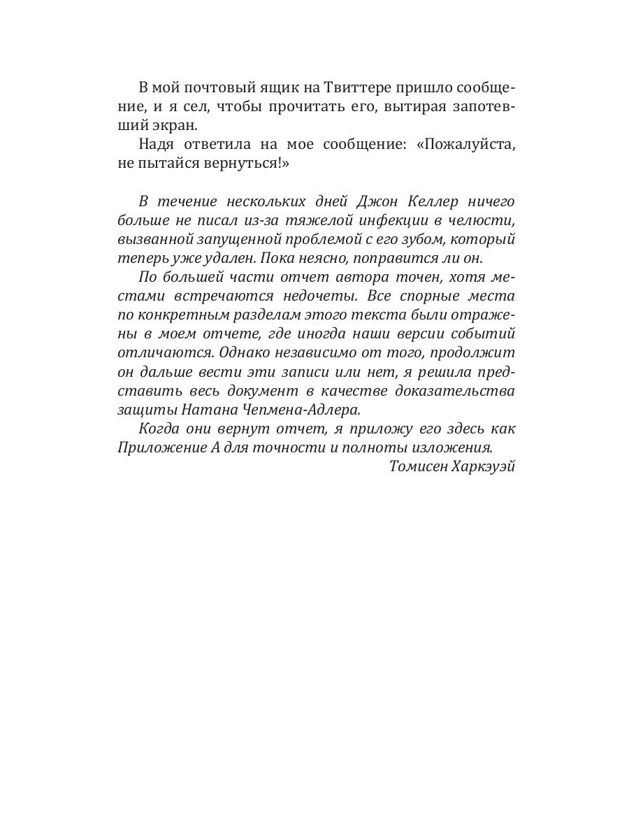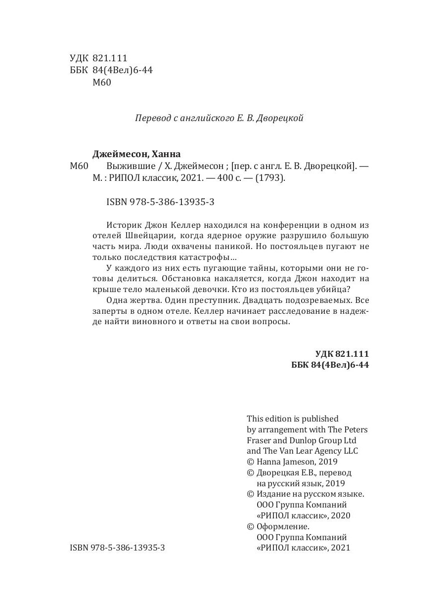Историк Джон Келлер находился на конференции в одном из отелей Швейцарии, когда ядерное оружие разрушило большую часть мира. Люди охвачены паникой. Но постояльцев пугают не только последствия катастрофы... У каждого из них есть пугающие тайны, которыми они не готовы делиться. Обстановка накаляется, когда Джон находит на крыше тело маленькой девочки. Кто из постояльцев убийца? Одна жертва. Один преступник. Двадцать подозреваемых. Все заперты в одном отеле. Келлер начинает расследование в надежде найти виновного и ответы на свои вопросы.| Издательство | Рипол Классик |