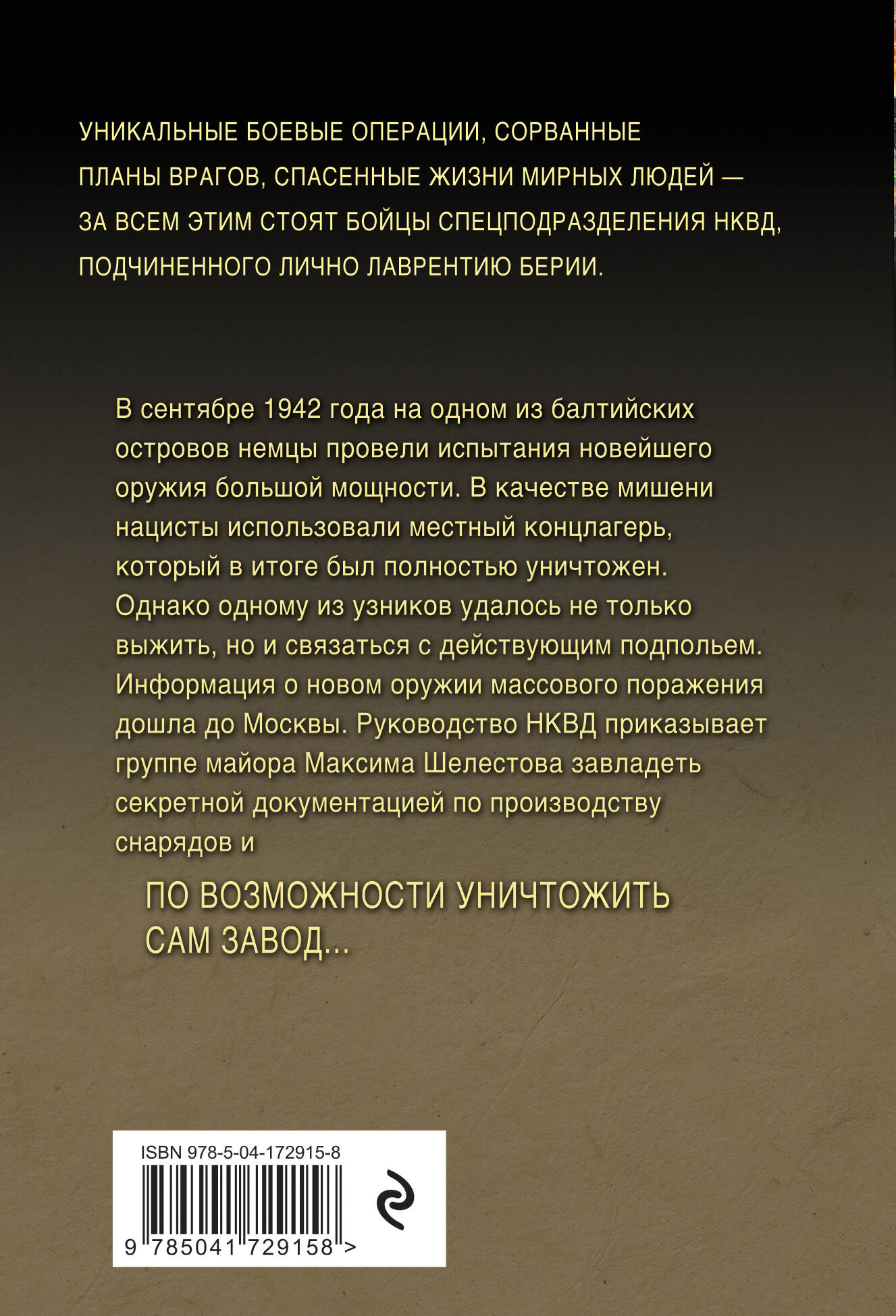 Роман о военном времени, о сложных судьбах и опасной работе неизвестных героев, вошедших в ударный состав «спецназа Берии». Общий тираж книг А. Тамоникова - более 10 миллионов экземпляров. В сентябре 1942 года на одном из балтийских островов немцы провели испытания новейшего оружия большой мощности. В качестве мишени нацисты использовали местный концлагерь, который в итоге был полностью уничтожен. Однако, одному из узников не только удалось выжить, но и связаться с действующим подпольем. Информация о новом оружии массового поражения дошла до Москвы. Руководство НКВД приказывает группе майора Максима Шелестова завладеть секретной документацией по производству снарядов и, по возможности, уничтожить сам завод… «Эта книга хороша тем, что в ней проведена верная главная мысль: в НКВД Лаврентия Берии умели верить людям, потому что им умел верить сам нарком. История группы майора Шелестова сходна с реальной историей крупного агента абвера, бывшего штабс-капитана царской армии Нелидова, попавшего на Лубянку в сентябре 1939 года. Тем более вероятными выглядят на фоне истории Нелидова приключения Максима Шелестова и его товарищей, описанные в этом романе». - С. Кремлев| Издательство | ООО "Издательство "Эксмо" |