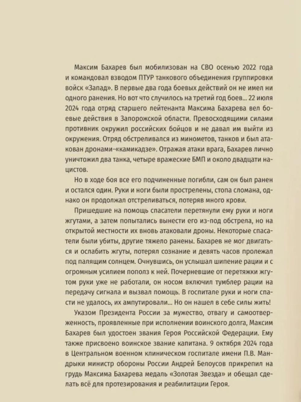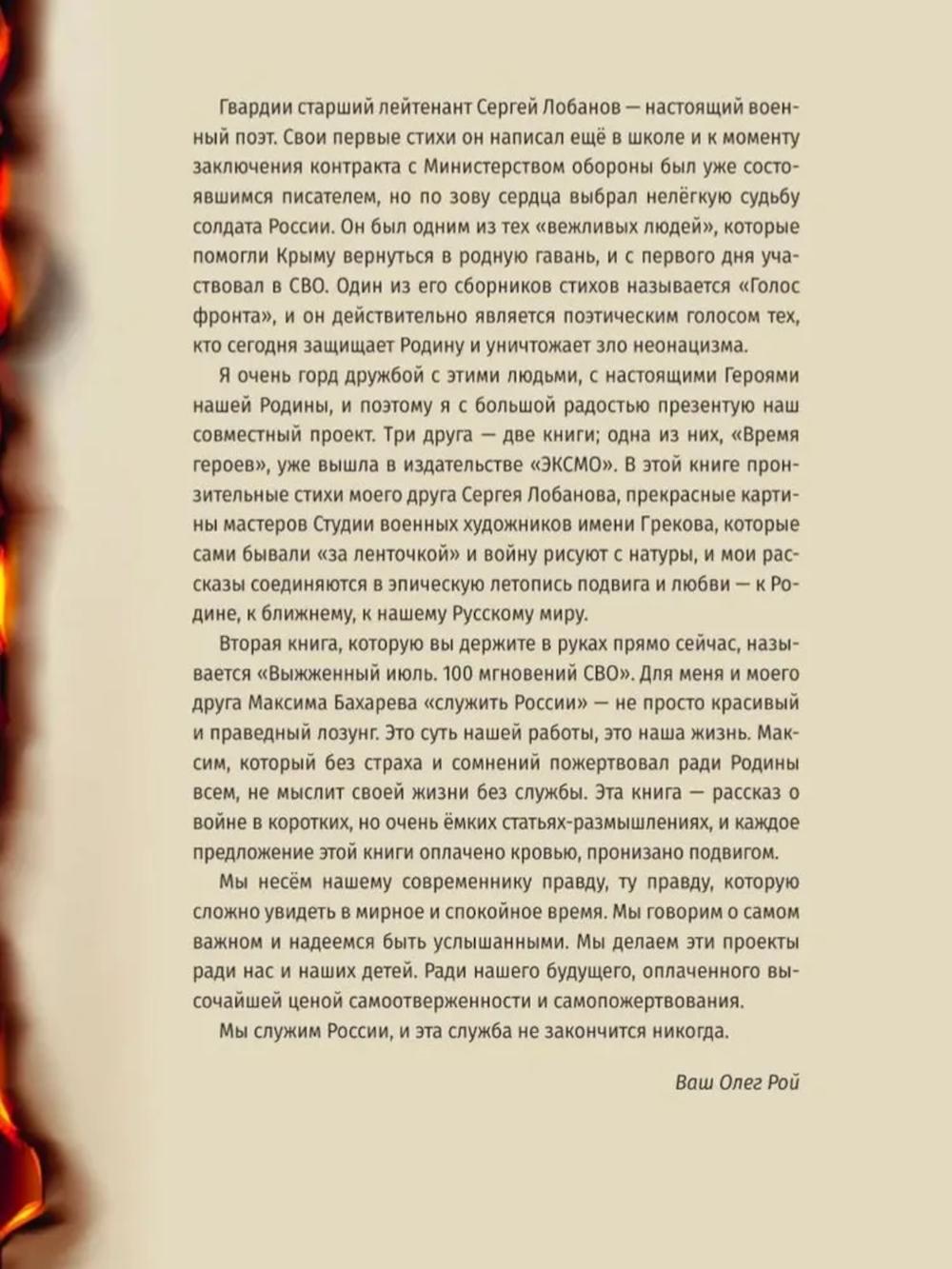Книга «Выжженный июль. 100 мгновений СВО» уникальна и необычна со многих сторон, прежде всего потому, что она создана командой единомышленников, участников и очевидцев СВО, не понаслышке знающих, что происходит там, «за ленточкой». Она вобрала в себе разные составные части художественного и исторического осмысления Специальной военной операции, которые действительно складываются в «100 мгновений» этого эпохального события. Известный писатель и общественный деятель, автор целого цикла романов о событиях на Донбассе, участник многочисленных «десантов» в зону СВО Олег Рой в своих очерках-эссе освещает самые острые и животрепещущие моменты противостояния с оружием в руках неонацизму киевского режима и напору коллективного Запада, вновь поставившего задачу «победить» нашу страну. «Пронзительным и звенящим» стержнем книги выступают рассказы о буднях и дорогах, приметах и испытаниях войны Героя Российской Федерации, члена Союза писателей России Максима Бахарева, который был мобилизован на СВО осенью 2022 года, командовал взводом ПТУР танкового объединения, а 22 июля 2024 года со своим отрядом во время боевых действий в Запорожской области попал в окружение. Отражая атаки врага, Бахарев лично уничтожил два танка, четыре вражеские БМП и около двадцати нацистов. Но в ходе боя все его подчиненные погибли, сам он был очень тяжело ранен и лишь с огромными потерями выведен с линии боевого соприкосновения. В госпитале руки и ноги воина спасти не удалось, их ампутировали... Но он нашел в себе силы жить! Сегодня капитан Бахарев - преподаватель Военного университета Министерства обороны, кавалер ордена Святого благоверного князя Димитрия Донского I степени, врученного ему патриархом Московским и всея Руси Кириллом. Рассказы Бахарева о пережитом на СВО - это своеобразный памятник эпохе героев, вставших на защиту своей Родины. Богатым иллюстративным рядом книги выступают плакаты проекта Z Files, в рамках которого с первых дней СВО по инициативе сотрудников Рекламно-информационного агентства «АРМИЯ РОССИИ» Министерства обороны РФ было создано более 500 уникальных графических работ. Это не просто плакаты - это истории о наших бойцах и легендарной технике, о силе веры и несокрушимой правде, о славных страницах нашего прошлого и подвигах героев, о воинских специальностях и боевых наградах. Яркие визуальные образы плакатов дополняет в книге историческая хроника событий, героев и родов войск, участвующих в СВО, составленная историком Ю.Н. Лубченковым. Украшением книги выступают также стихи поэта-фронтовика Сергея Лобанова, кавалера ордена Мужества, автора сборника «Голос фронта» и соавтора Олега Роя по книге «Время героев».| Издательство | Вече |
