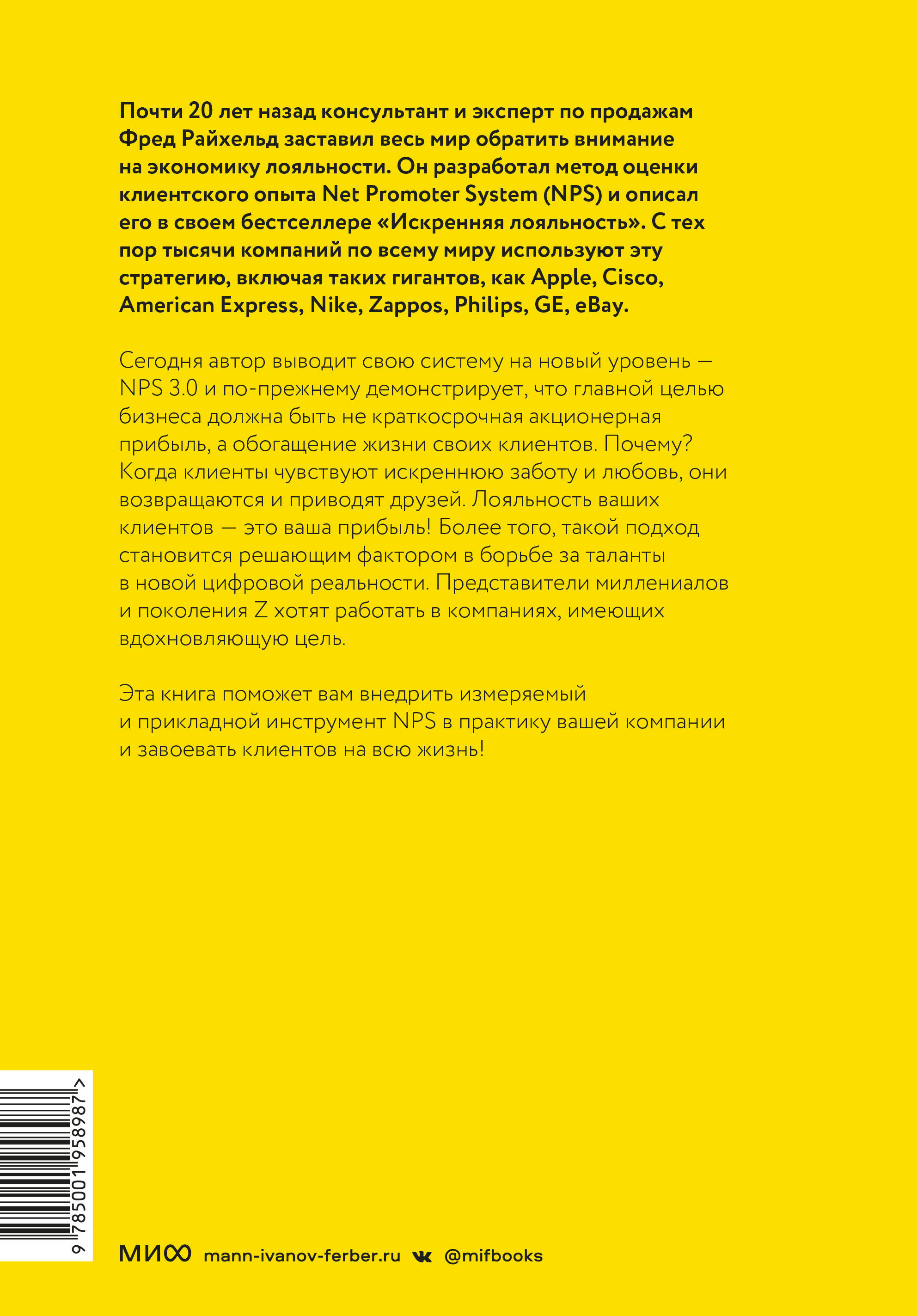 Эта книга поможет внедрить измеряемый и прикладной инструмент NPS в практику компании и завоевать клиентов на всю жизнь. Почти 20 лет назад консультант и эксперт по продажам Фред Райхельд заставил весь мир обратить внимание на экономику лояльности. Он разработал метод оценки клиентского опыта Net Promoter System (NPS) и описал его в своем бестселлере "Искренняя лояльность". С тех пор тысячи компаний по всему миру используют эту стратегию, включая таких гигантов, как Apple, Cisco, American Express, Nike, Zappos, Philips, GE, eBay. Сегодня автор выводит свою систему на новый уровень - NPS 3.0 и по-прежнему демонстрирует, что главной целью бизнеса должна быть не краткосрочная акционерная прибыль, а обогащение жизни своих клиентов. Почему? Когда клиенты чувствуют искреннюю заботу и любовь, они возвращаются и приводят друзей. Лояльность ваших клиентов - это ваша прибыль! Более того, такой подход становится решающим фактором в борьбе за таланты в новой цифровой реальности. Представители миллениалов и поколения Z хотят работать в компаниях, имеющих вдохновляющую цель. Для кого эта книга: Для тех, кто хочет внедрить NPS в практику своей компании. Для всех, кто стремится завоевать клиентов на всю жизнь.| Издательство | МАНН, ИВАНОВ И ФЕРБЕР ООО |
