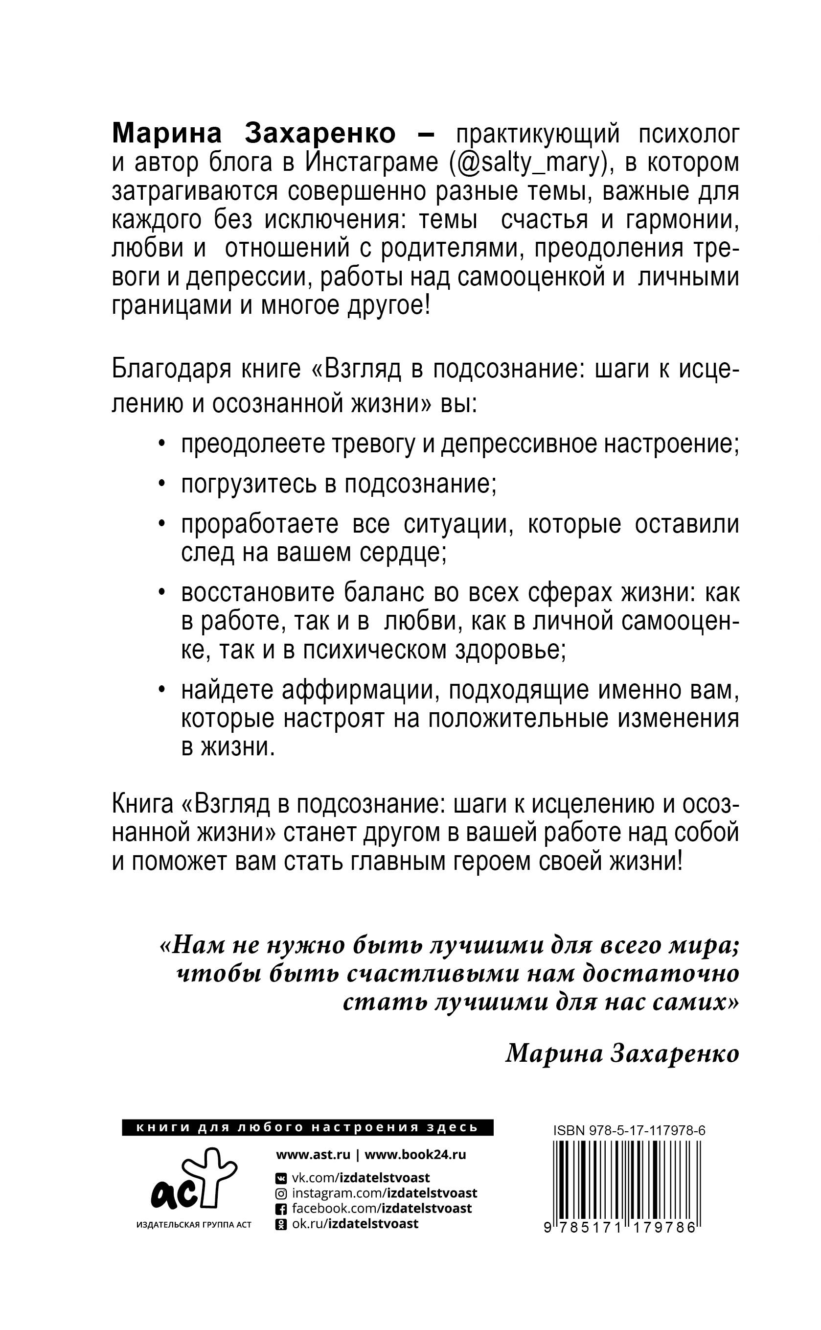Марина Захаренко - практикующий психолог и автор блога в Инстаграме (@salty_mary), в котором затрагиваются совершенно разные темы, важные для каждого без исключения: темы счастья и гармонии, любви и отношений с родителями, преодоления тревоги и депрессии, работы над самооценкой и личными границами и многое другое! Благодаря книге «Взгляд в подсознание: шаги к исцелению и осознанной жизни» вы: • преодолеете тревогу и депрессивное настроение; • погрузитесь в подсознание; • проработаете все ситуации, которые оставили след на вашем сердце; • восстановите баланс во всех сферах жизни: как в работе, так и в любви, как в личной самооценке, так и в психическом здоровье; • найдете аффирмации, подходящие именно вам, которые настроят на положительные изменения в жизни. Книга «Взгляд в подсознание: шаги к исцелению и осознанной жизни» станет другом в вашей работе над собой и поможет вам стать главным героем своей жизни! "Нам не нужно быть лучшими для всего мира; чтобы быть счастливыми, нам достаточно стать лучшими для нас самих" Марина Захаренко| Издательство | ИЗДАТЕЛЬСТВО "АСТ" |