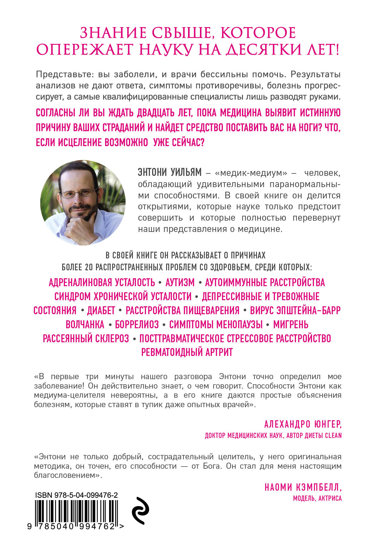 Энтони Уильям - «медик-медиум», человек, обладающий удивительными паранормальными способностями. В своей книге он делится с нами открытиями, которые науке только предстоит совершить и которые полностью перевернут наши представления о медицине. Представьте: вы заболели, и врачи бессильны помочь. Результаты анализов не дают ответа, симптомы противоречивы, болезнь прогрессирует, а самые квалифицированные специалисты лишь разводят руками. Согласны ли вы ждать двадцать лет, пока медицина выявит истинную причину ваших страданий и найдет средство поставить вас на ноги? Что, если исцеление возможно уже сейчас? В своей книге Энтони Уильям рассказывает о причинах более 20 распространенных заболеваний, среди которых: - адреналиновая усталость; - аутизм; - аутоиммунные расстройства; - синдром хронической усталости; - депрессивные и тревожные состояния; - диабет; - расстройства пищеварения; - вирус Эпштейна-Барр; - волчанка; - боррелиоз; - симптомы менопаузы; - мигрень; - рассеянный склероз; - посттравматическое стрессовое расстройство; - ревматоидный артрит. Также Энтони рассказывает об истинных потребностях организма и делится простыми и эффективными методами, позволяющими восстановить гармонию и исцелиться. «В первые три минуты нашего разговора Энтони точно определил мое заболевание! Он действительно знает, о чем говорит. Способности Энтони как медиума-целителя невероятны, а в его книге даются простые объяснения болезням, которые ставят в тупик даже опытных врачей». - Алехандро Юнгер, доктор медицинских наук, автор диеты Clean «Энтони не только добрый, сострадательный целитель, у него оригинальная методика, он точен, его способности - от Бога. Он стал для меня настоящим благословением». - Наоми Кэмпбелл, модель, актриса| Издательство | ООО "Издательство "Эксмо" |