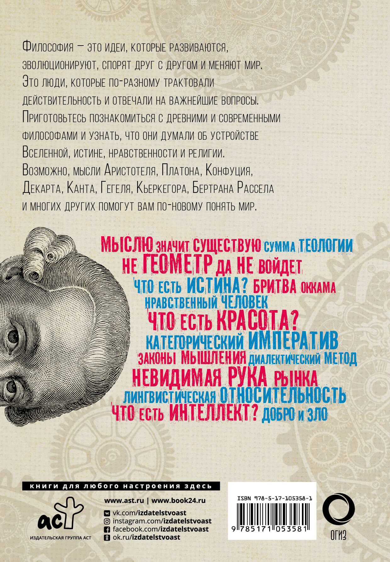 Философия - это идеи, которые развиваются, эволюционируют, спорят друг с другом и меняют мир. Это люди, которые по-разному трактовали действительность и отвечали на важнейшие вопросы. Приготовьтесь познакомиться с древними и современными философами и узнать, что они думали об устройстве Вселенной, истине, нравственности и религии. Возможно, мысли Аристотеля, Платона, Конфуция, Декарта, Канта, Гегеля, Кьеркегора, Бертрана Рассела и многих других помогут вам по-новому понять мир.| Издательство | Издательство "АСТ" |