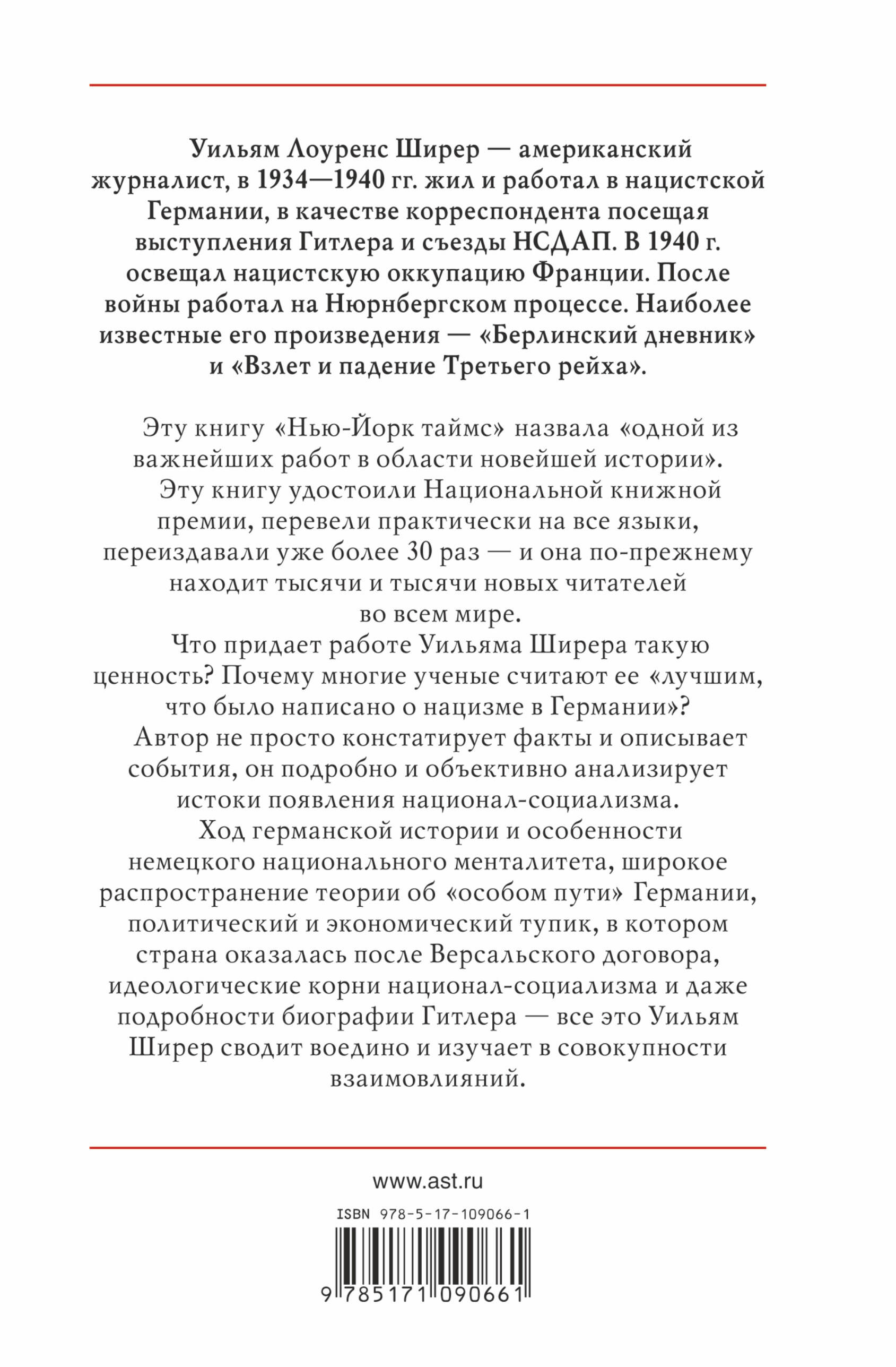 Эту книгу "Нью-Йорк таймс" назвала "одной из важнейших работ в области новейшей истории". Эту книгу удостоили Национальной книжной премии, перевели практически на все языки, переиздавали уже более 30 раз - и она по-прежнему находит тысячи и тысячи новых читателей во всем мире. Что придает работе Уильяма Ширера такую ценность? Почему многие ученые считают ее "лучшим, что было написано о нацизме в Германии"? Автор не просто констатирует факты и описывает события, он подробно и объективно анализирует истоки появления национал-социализма. Ход германской истории и особенности немецкого национального менталитета, широкое распространение теории об "особом пути" Германии, политический и экономический тупик, в котором страна оказалась после Версальского договора, идеологические корни национал-социализма и даже подробности биографии Гитлера - все это Уильям Ширер сводит воедино и изучает в совокупности взаимовлияний.