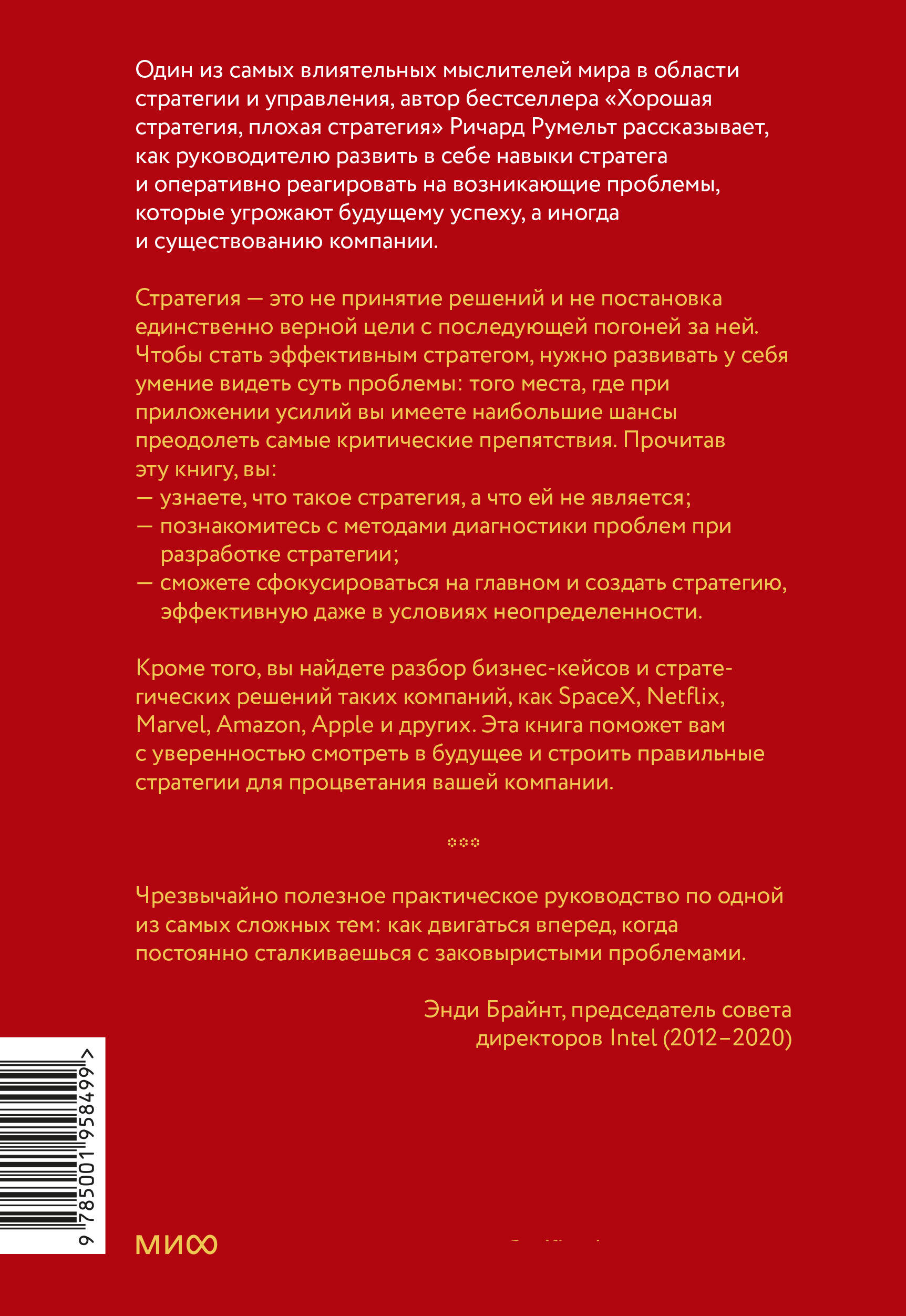 Ричард Румельт - один из самых влиятельных мыслителей мира в области стратегии и управления, автор бестселлера "Хорошая стратегия, плохая стратегия" - рассказывает, как руководителю развить в себе навыки стратега и оперативно реагировать на проблемы, угрожающие будущему успеху, а иногда и существованию компании. Стратегия - это не принятие решений и не постановка единственно верной цели с последующей погоней за ней. Чтобы стать эффективным стратегом, нужно развивать в себе умение видеть суть проблемы - ту часть клубка вопросов, которая одновременно и важна, и решаема. Прочитав эту книгу, вы: ― узнаете, что такое стратегия, а что ей не является; ― познакомитесь с методами диагностики проблем при разработке стратегии; ― сможете сфокусироваться на главном и создать стратегию, эффективную даже в условиях неопределенности. Кроме того, вы найдете разбор бизнес-кейсов и стратегических решений таких компаний, как SpaceX, Netflix, Marvel, Amazon, Apple и других. Для кого эта книга: Для тех, кто стремится строить правильные стратегии для процветания компании. Для бизнес-лидеров, которые хотят с уверенностью смотреть в будущее.| Издательство | МАНН, ИВАНОВ И ФЕРБЕР ООО |