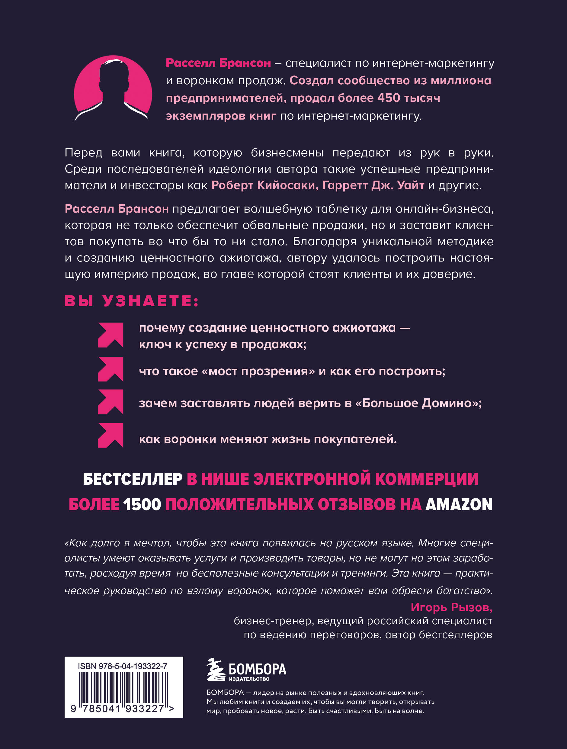 Бестселлер в нише электронной коммерции. Более 1500 положительных отзывов на Amazon. Перед вами книга, которую бизнесмены передают из рук в руки. Среди последователей идеологии автора такие успешные предприниматели и инвесторы, как Роберт Кийосаки, Гаррет Дж. Уайт и другие. Расселл Брансон - специалист по интернет-маркетингу и воронкам продаж. Создал сообщество из миллиона предпринимателей, продал более 450 тысяч экземпляров книг по интернет-маркетингу. Автор предлагает волшебную таблетку для онлайн-бизнеса, которая обеспечит не только обвальные продажи, но и заставит клиентов покупать во что бы то ни стало. Благодаря уникальной методике и созданию ценностного ажиотажа автору удалось построить настоящую империю продаж, во главе которой стоят клиенты и их доверие. Вы узнаете: - почему создание ценностного ажиотажа - ключ к успеху в продажах; - что такое «мост прозрения» и как его построить; - зачем заставлять людей верить в «Большое Домино»; - как воронки меняют жизнь покупателей. «Как долго я мечтал, чтобы эта книга появилась на русском языке. Многие специалисты умеют оказывать услуги и производить товары, но не могут на этом заработать, расходуя время на бесполезные консультации и тренинги. Эта книга - практичное руководство по взлому воронок, которая поможет вам обрести богатство». - Игорь Рызов, бизнес-тренер, ведущий российский специалист по ведению переговоров, автор бестселлеров| Издательство | ООО "Издательство "Эксмо" |