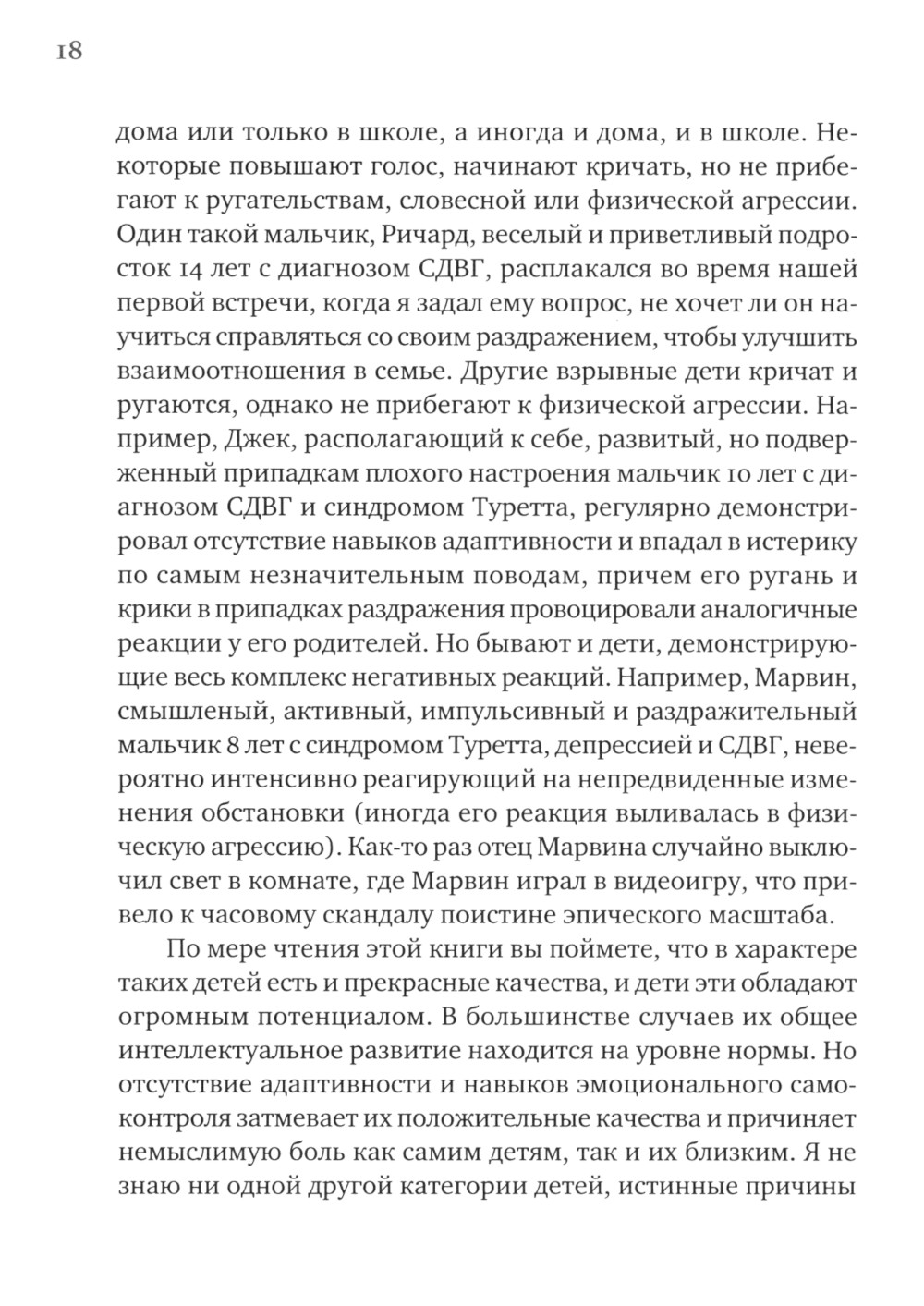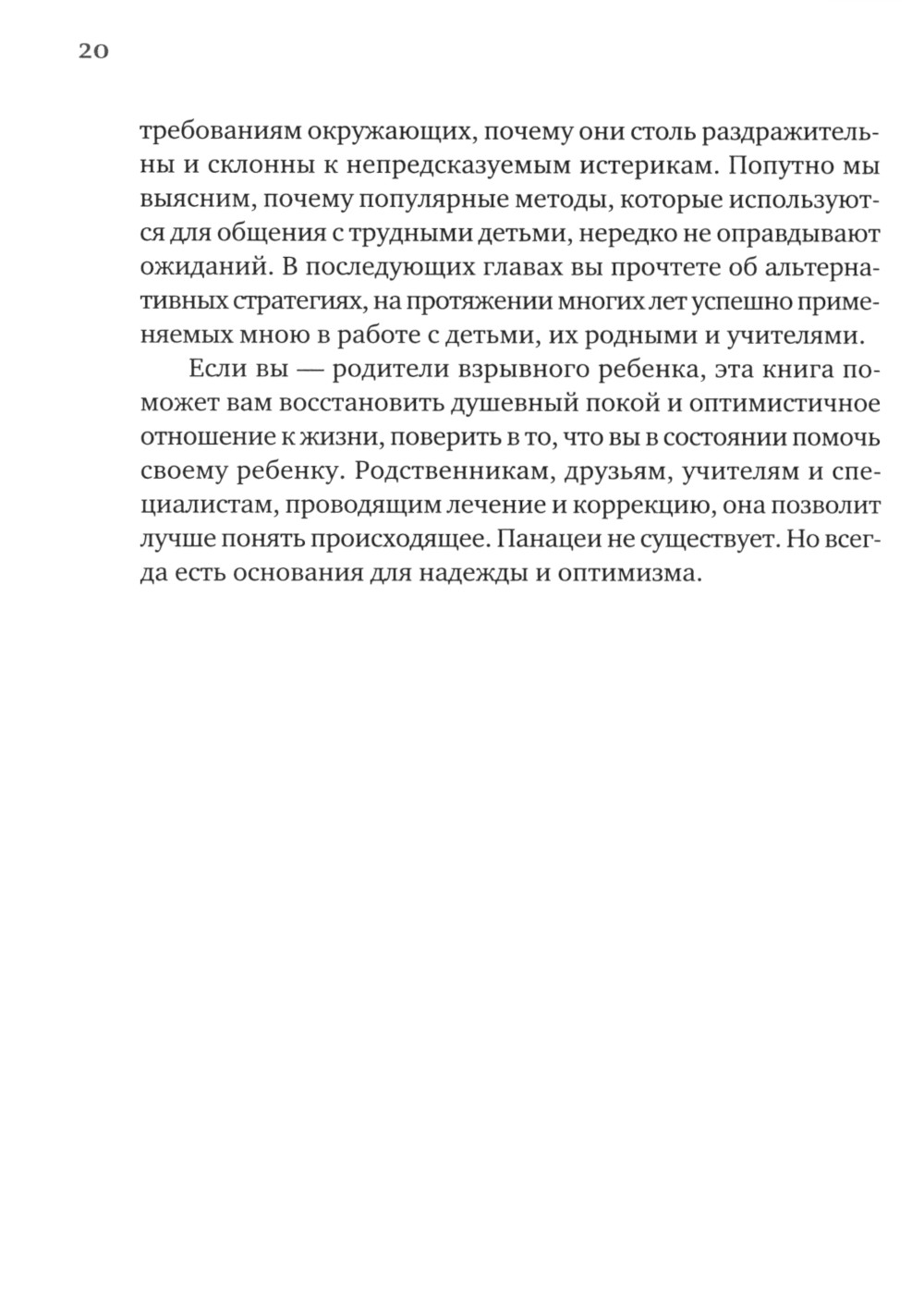 В книге профессора Росса В. Грина, специалиста по клинической психологии и психиатрии медицинской школы Гарварда, описывается новый подход к детям, за которыми закрепился эпитет «взрывные». Эти дети демонстрируют непереносимое для окружающих поведение: внезапно впадают в «неадекватное» состояние, зачастую проявляют физическую и словесную агрессию, устраивают длительные скандалы. Метод доктора Грина был разработан, чтобы помочь взрывным детям научиться регулировать свое поведение, справляться со вспышками гнева и раздражения, мирно разрешать споры и разногласия. Книга адресована родителям, психологам, воспитателям и учителям.| Издательство | Теревинф |