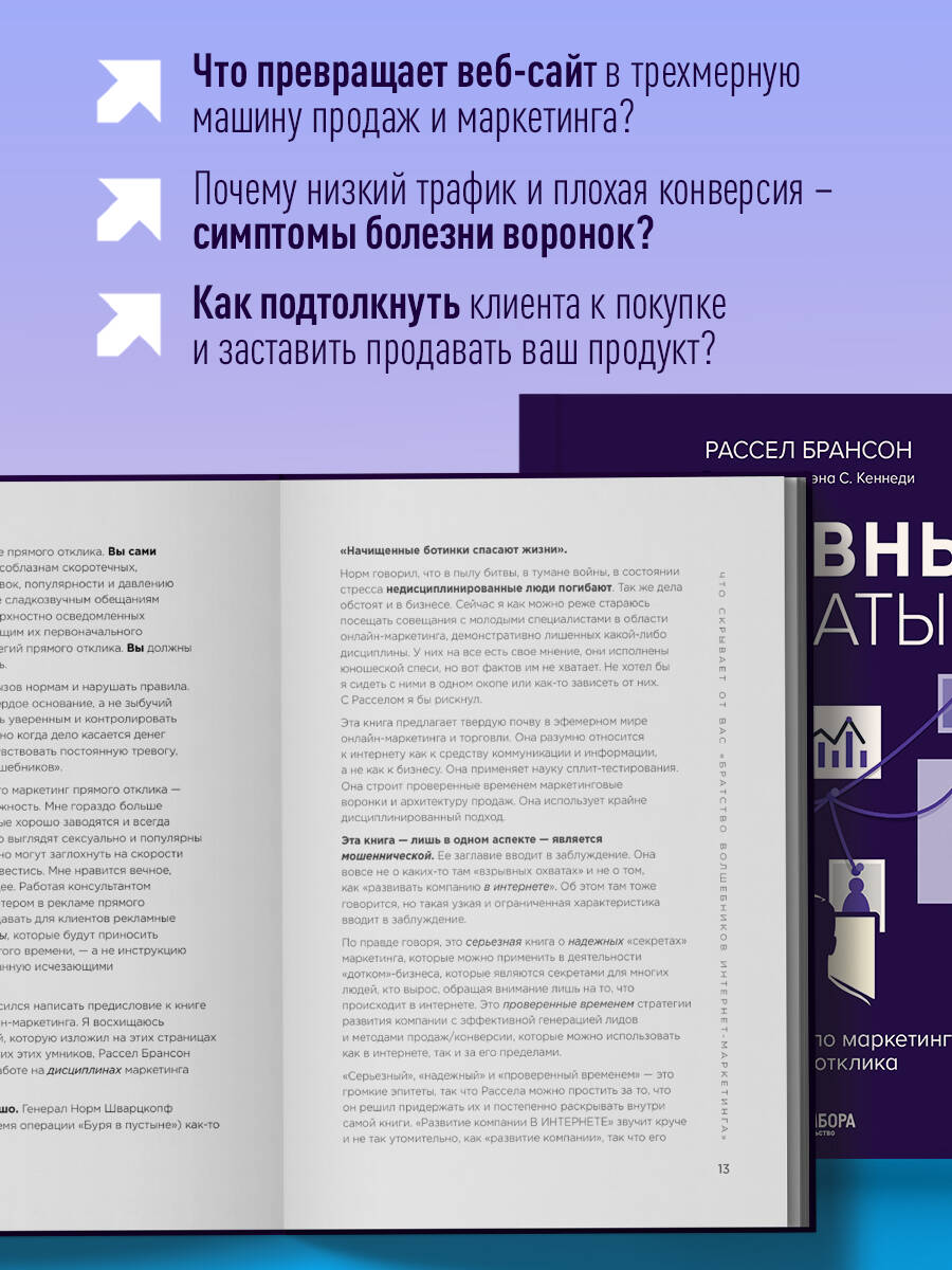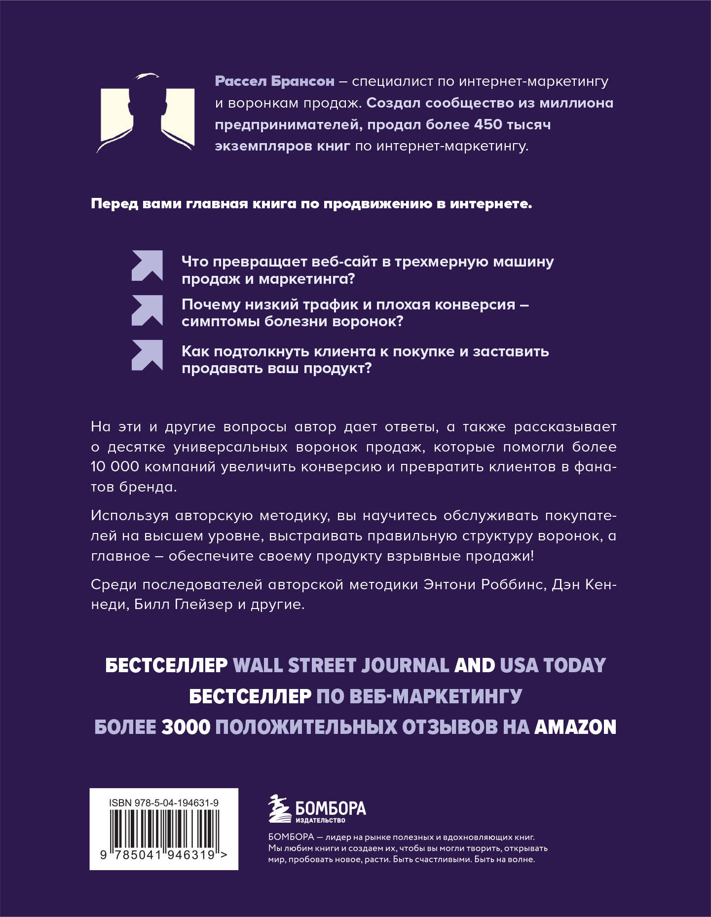 Бестселлер Wall Street Journal and USA Today Бестселлер по веб-маркетингу. Более 3000 положительных отзывов на Amazon. Перед вами главная книга по продвижению в интернете. • Что превращает веб-сайт в трехмерную машину продаж и маркетинга? • Почему низкий трафик и плохая конверсия - симптомы болезни воронок? • Как подтолкнуть клиента к покупке и заставить продавать ваш продукт? На эти и другие вопросы автор дает ответы, а также рассказывает о десятке универсальных воронок продаж, которые помогли более 10 000 компаний увеличить конверсию и превратить клиентов в фанатов бренда. Используя авторскую методику, вы научитесь обслуживать покупателей на высшем уровне, выстраивать правильную структуру воронок, а главное - обеспечите своему продукту взрывные продажи! Среди последователей авторской методики Энтони Роббинс, Дэн Кеннеди, Билл Глейзер и другие.