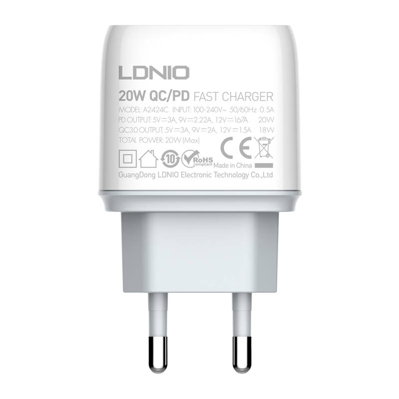 Зарядное устройствоLDNIO A2424C оснащено 2 портами (USB и USB-C) и поддерживает такие протоколы быстрой зарядки, как PD и QC3.0, поэтому вы сможете заряжать 2 устройства одновременно в кратчайшие сроки! Кроме того, устройство отличается мощностью до 20 Вт и легким, компактным дизайном. Кроме того, он оснащен практичным выключателем. В комплект входит кабель Lightning.