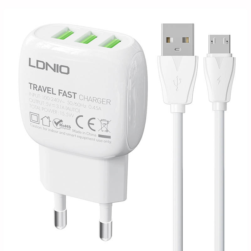 Сетевое зарядное устройство LDNIO A3315 3USB + кабель Micro USB