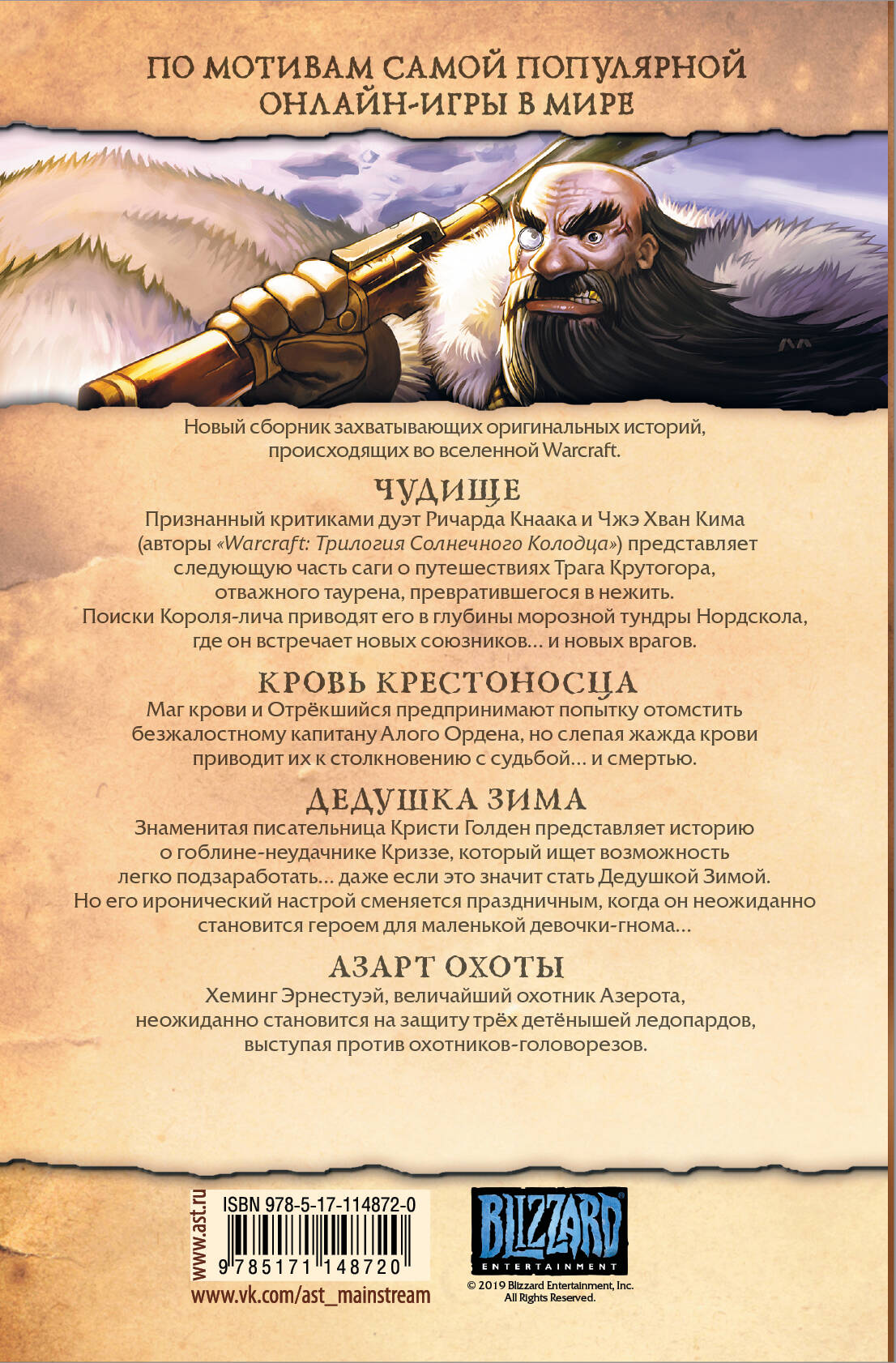 В новом сборнике захватывающих оригинальных историй, происходящих во вселенной Warcraft, продолжается приключение Трага Крутогора. На пути в обитель Короля-лича неупокоенному таурену предстоит встреча с храбрыми таунка и новыми врагами. Крестоносцы Алого Ордена ведут отчаянную борьбу против нечисти в Азероте, но на их пусти встают маг крови и Отрёкшийся, которые жаждут мести. Также в сборник вошли снежная история Кристи Голден о гоблине-неудачнике Криззе, который ищет возможность легко подзаработать, и легенда о величайшем охотнике Азерота, Хеминге Эрнестуэе.| Издательство | ИЗДАТЕЛЬСТВО "АСТ" |