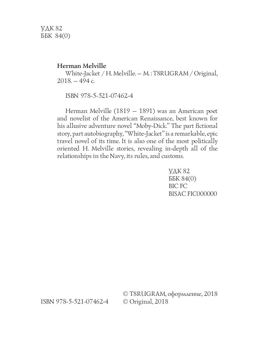 Herman Melville (1819 - 1891) was an American poet and novelist of the American Renaissance, best known for his allusive adventure novel "Moby-Dick". The part fictional story, part autobiography, "White-Jacket" is a remarkable, epic travel novel of its time. It is also one of the most politically oriented H. Melville stories, revealing in-depth all of the relationships in the Navy, its rules, and customs.| Издательство | Т8 RUGRAM |