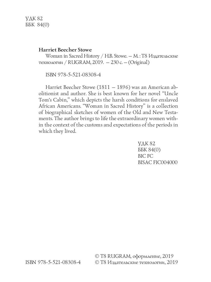 Harriet Beecher Stowe (1811 - 1896) was an American abolitionist and author. She is best known for her novel "Uncle Tom's Cabin," which depicts the harsh conditions for enslaved African Americans. "Woman in Sacred History" is a collection of biographical sketches of women of the Old and New Testaments. The author brings to life the extraordinary women within the context of the customs and expectations of the periods in which they lived.| Издательство | Т8 RUGRAM |