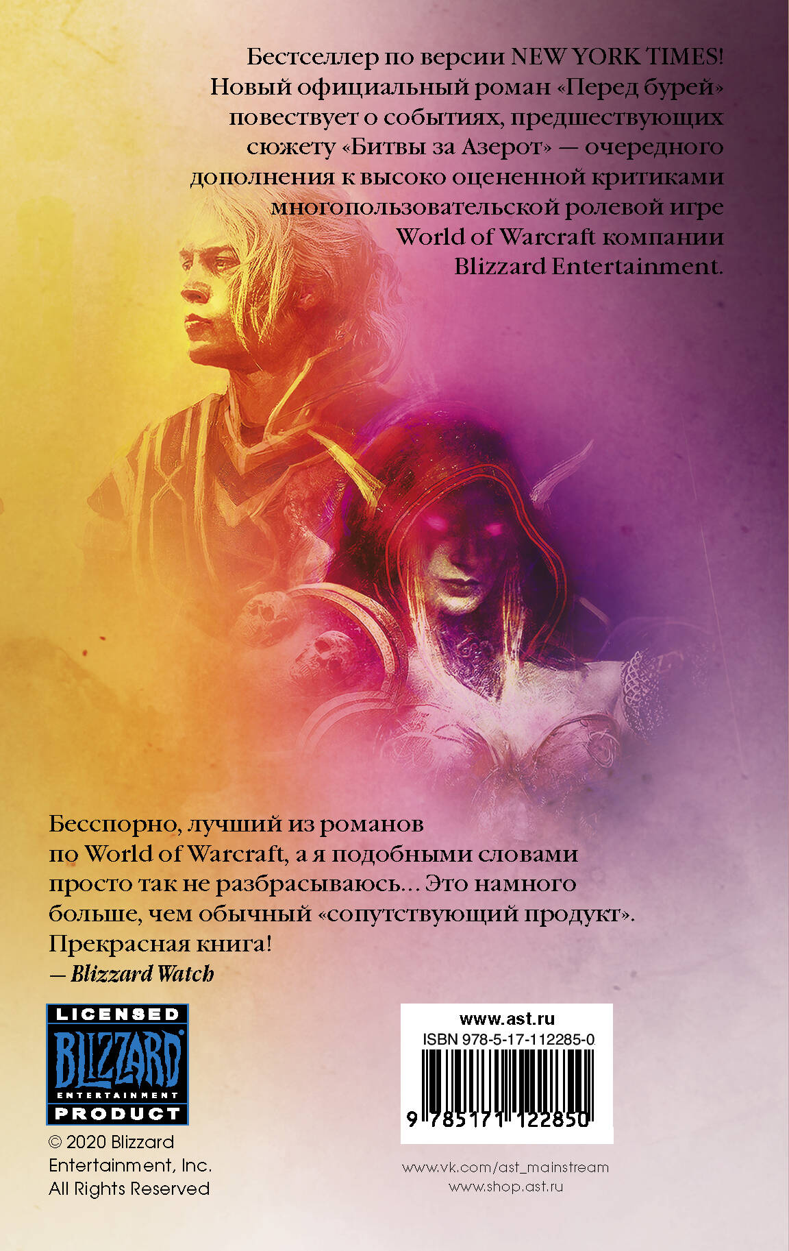 КОНЕЦ АЗЕРОТА БЛИЗОК. Азерот умирает. Общими силами Орда и Альянс одержали победу над демоническим Пылающим Легионом, но глубоко в недрах мира разражается небывалая катастрофа. Меч Саргераса смертельно ранил Азерот в самое сердце - таким было последнее злодеяние падшего титана. У Андуина Ринна, короля Штормграда, и у Сильваны Ветрокрылой, вождя Орды и королевы Отрекшихся, почти нет времени ни на восстановление уцелевшего в страшной войне, ни на скорбь по утраченному. Из колоссальной раны, нанесенной Азероту, течет наверх таинственный минерал под названием "азерит". В достойных руках странное золотистое вещество способно творить великие чудеса созидания, попав в неправедные руки - станет причиной немыслимых разрушений. Пока силы Орды и Альянса стремятся поскорее раскрыть тайны азерита и исцелить умирающий мир, Андуин приводит в действие отчаянный план с целью установить между Альянсом и Ордой прочный мир. Между тем азерит угрожает нарушить равновесие сил, и, чтобы добиться успеха, без доверия Сильваны Андуину не обойтись. Но у Темной Госпожи, как обычно, имеются свои темные замыслы. Дабы примирение стало возможным, необходимо покончить с давней кровопролитной враждой. Но есть на свете ряд истин, которых не понимает и не приемлет ни одна сторона, и амбиции, от которых никто не желает отказываться. К тому же, Орда и Альянс осознают силу азерита, и затухший, но не угасший конфликт грозит перерасти в новую войну - войну, способную обречь на гибель весь Азерот.| Издательство | Издательство "АСТ" |