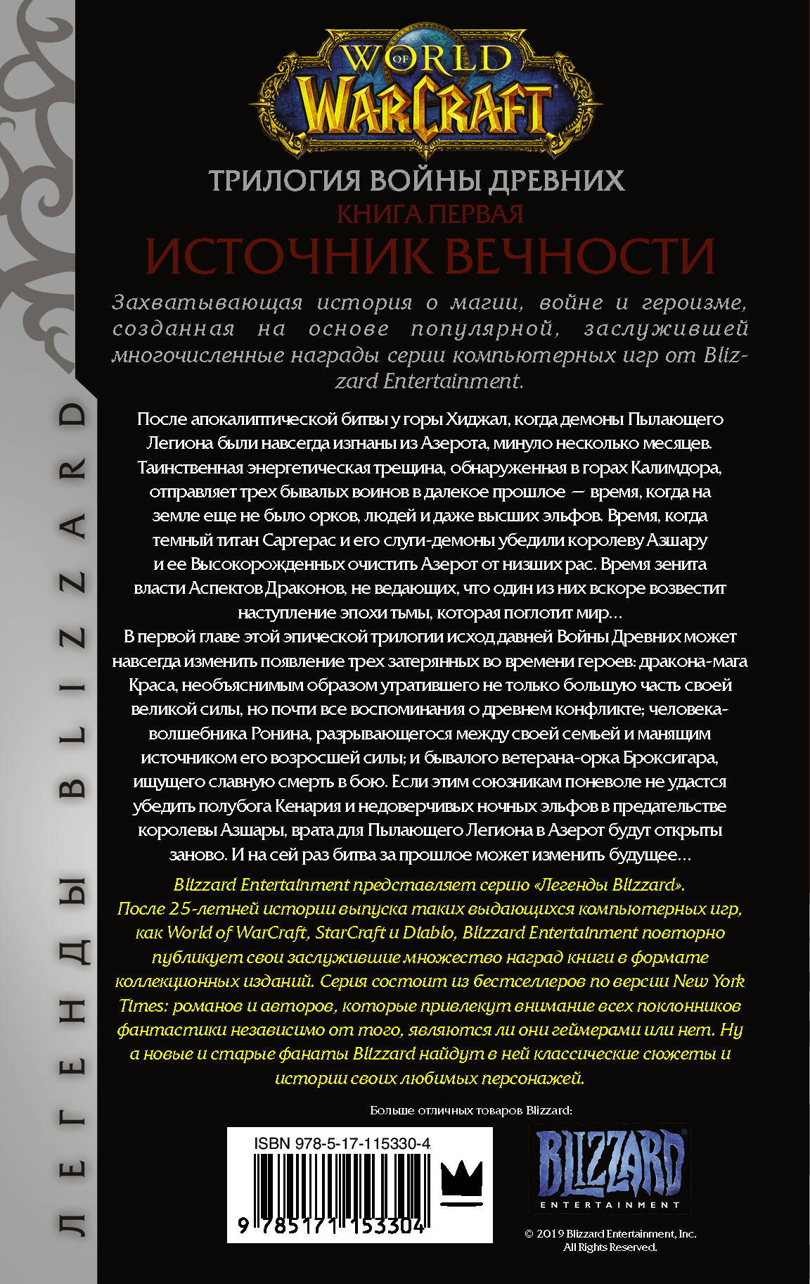 После апокалиптической битвы у горы Хиджал, когда демоны Пылающего Легиона были навсегда изгнаны из Азерота, минуло несколько месяцев. Таинственная энергетическая трещина, обнаруженная в горах Калимдора, отправляет трех бывалых воинов в далекое прошлое - время, когда на земле еще не было орков, людей и даже высших эльфов. Время, когда темный титан Саргерас и его слуги-демоны убедили королеву Азшару и ее Высокорожденных очистить Азерот от низших рас. Время зенита власти Аспектов Драконов, не ведающих, что один из них вскоре возвестит наступление эпохи тьмы, которая поглотит мир... В первой главе этой эпической трилогии исход давней Войны Древних может навсегда изменить появление трех затерянных во времени героев: дракона-мага Краса, необъяснимым образом утратившего не только большую часть своей великой силы, но почти все воспоминания о древнем конфликте; человека-волшебника Ронина, разрывающегося между своей семьей и манящим источником его возросшей силы; и бывалого ветерана-орка Броксигара, ищущего славную смерть в бою. Если этим союзникам поневоле не удастся убедить полубога Кенария и недоверчивых ночных эльфов в предательстве королевы Азшары, врата для Пылающего Легиона в Азерот будут открыты заново. И на сей раз битва за прошлое может изменить будущее...| Издательство | Издательство "АСТ" |