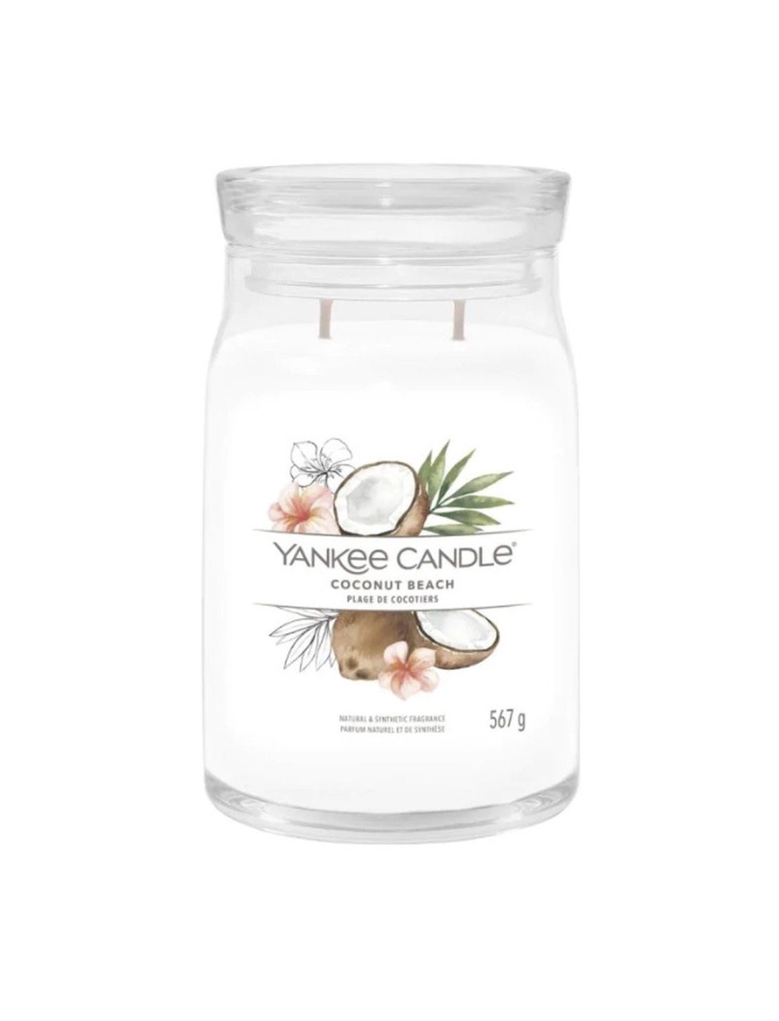 Yankee Candle Signature Coconut Beach - большая ароматическая свеча в стеклянной банке от легендарного бренда Yankee Candle с тёплым кремовым кокосовым ароматом и лёгкими тропическими нотами, объём 567 г, время горения 60-90 ч, идеальна для создания уютной летней атмосферы дома.