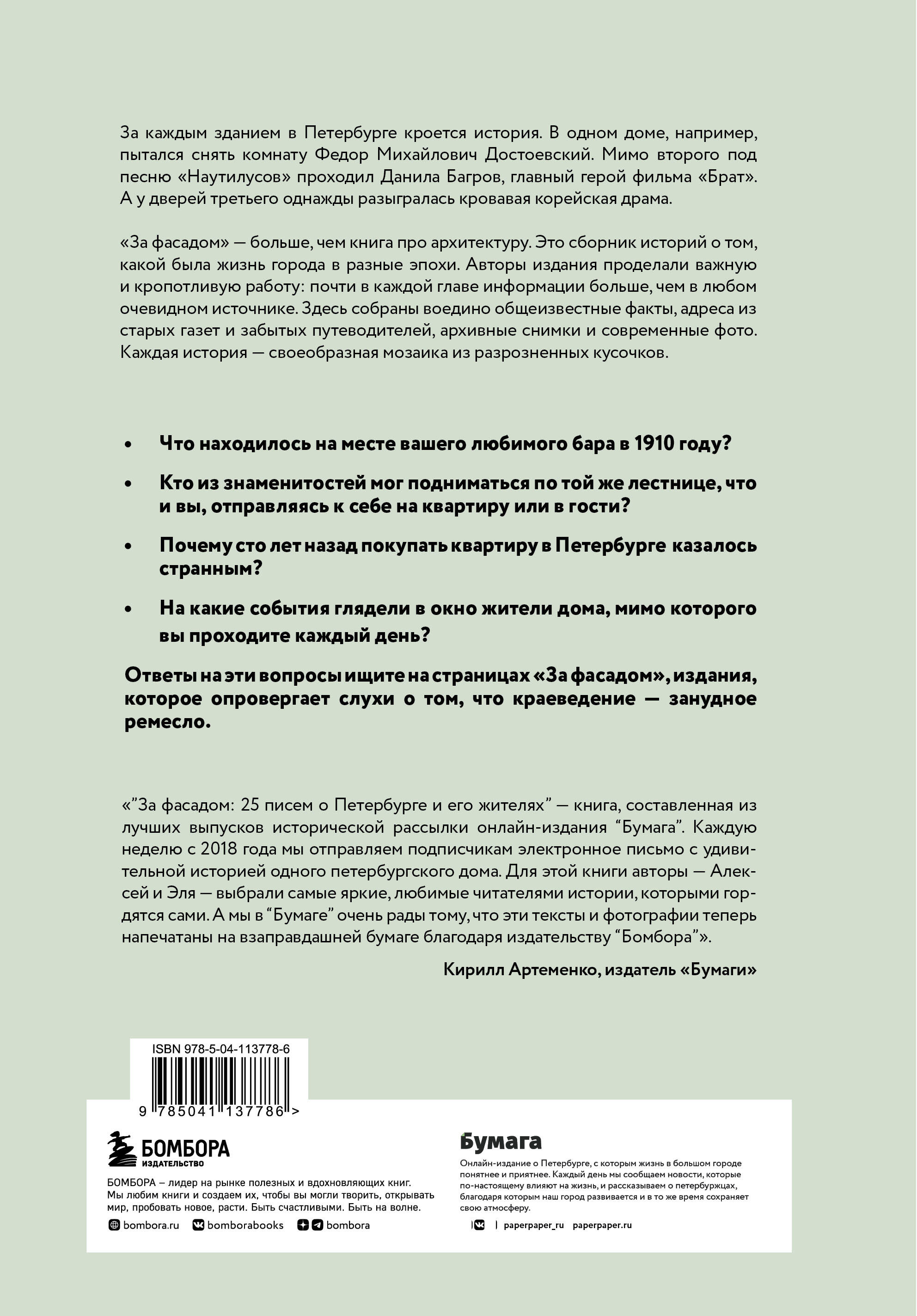 «За фасадом: 25 писем о Петербурге и его жителях» - это проект известного интернет-издания «Бумага», который теперь можно прочесть и в печатном виде. Авторы книги, молодые петербургские краеведы Алексей Шишкин и Эля Новопашенная, отобрали самые яркие и интересные истории петербургских строений. Прочитав эту книгу, вы не только «прогуляетесь» по северной столице, но и взглянете на нее совершенно с иного ракурса. Вы сможете: - узнать, где располагалась местная анархистская усадьба; - «побывать» в месте, где впервые были напечатаны «Путешествия из Петербурга в Москву»; - взглянуть на дом Куинджи, где сам художник никогда не жил. «За фасадом: 25 писем о Петербурге и его жителях» станет замечательным подарком тому, кто интересуется краеведением, но не всегда имеет возможность лично исследовать улицы города. Это издание не оставит равнодушным как коренных жителей города, так и тех, кто, увидев Санкт-Петербург однажды, влюбился в него навсегда.| Издательство | ООО "Издательство "Эксмо" |