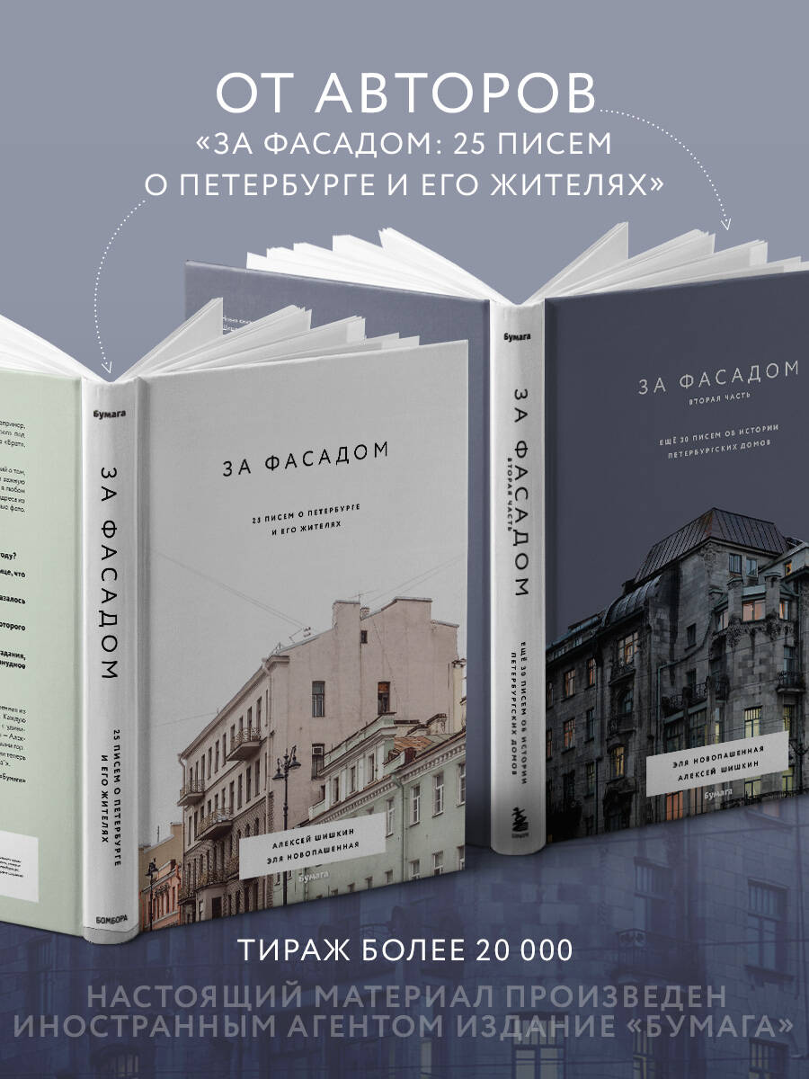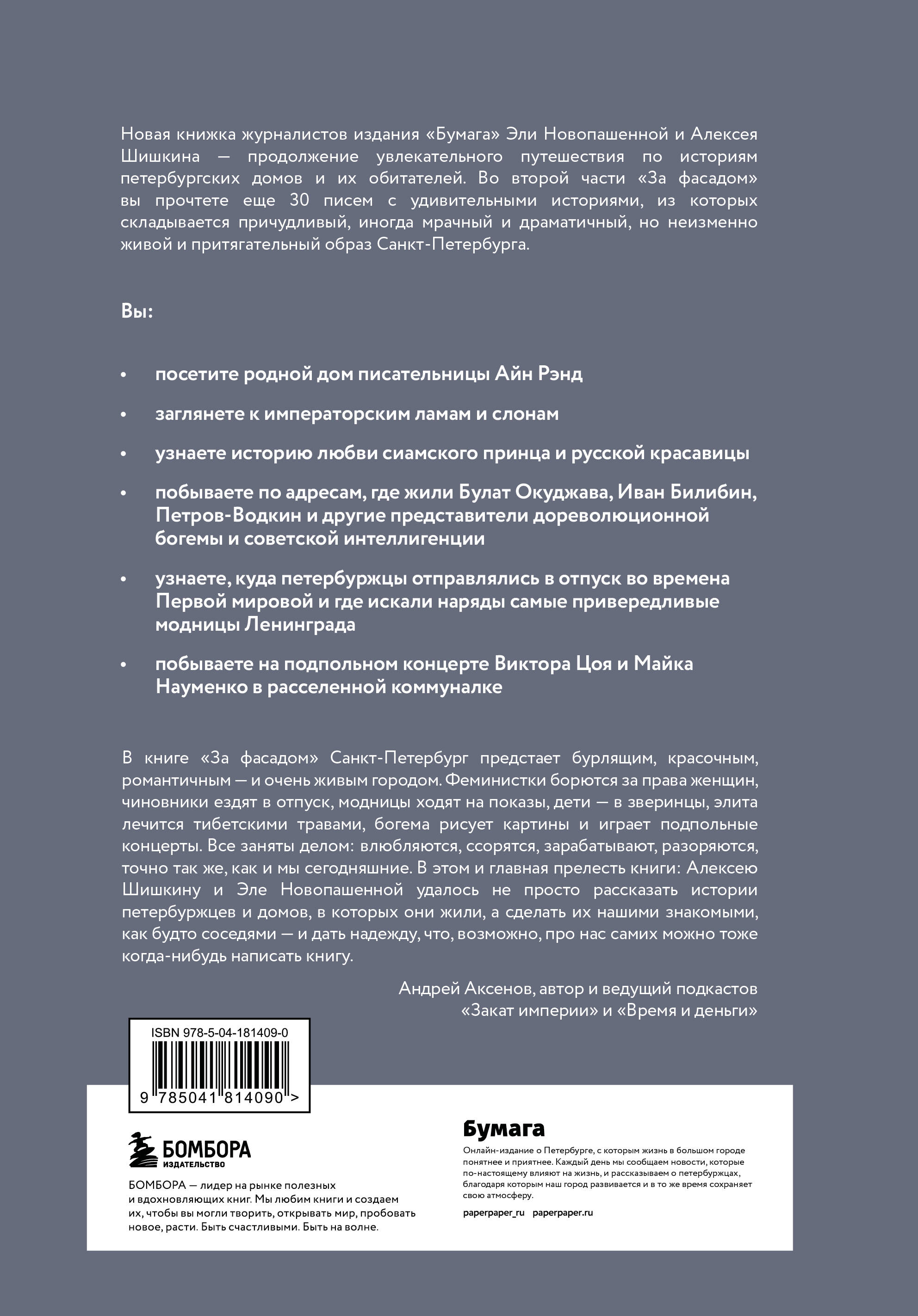 Во второй части книги "За фасадом" писатели Алексей Шишкин и Эля Новопашенная продолжают увлекательное исследование историй петербургских домов и их обитателей. Читатели найдут 30 новых писем с удивительными рассказами, которые формируют яркий, иногда мрачный, но всегда живой образ Санкт-Петербурга. Авторы справедливо отмечают: изучая старинные здания, мы создаем эмоциональную связь с их историей, поэтому в этой книге акцент, как и в первом издании, сделан на истории не столько самих домов, сколько их жителей. Здесь писательница Айн Рэнд соседствует с Булатом Окуджавой и Майком Науменко, здесь история любви сиамского принца переплетается с судьбами последних русских царей и первых советских эмигрантов. И каждый рассказ сопровождается фотографиями и иллюстрациями, погружающими читателей в другую эпоху и другие жизни.