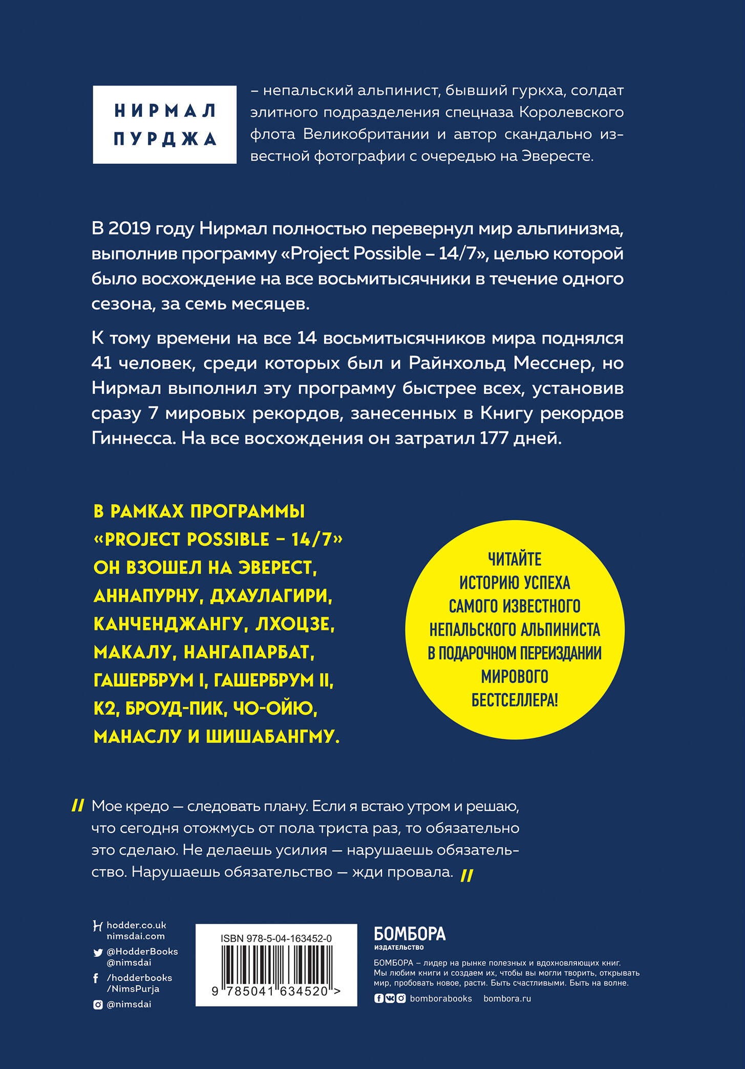 Нирмал Пурджа - непальский альпинист, бывший гуркха, солдат элитного подразделения спецназа Королевского флота Великобритании и автор скандально известной фотографии с очередью на Эвересте. В 2019 году Нирмал полностью перевернул мир альпинизма, выполнив программу «Project Possible - 14/7», целью которой было восхождение на все восьмитысячники в течение одного сезона, за семь месяцев. К тому времени на все 14 восьмитысячников мира поднялся 41 человек, среди которых был и Райнхольд Месснер, но Нирмал выполнил эту программу быстрее всех, установив сразу 7 мировых рекордов, занесенных в Книгу рекордов Гиннесса. На все восхождения он затратил 177 дней. В рамках программы "Project Possible - 14/7" он взошел на Эверест, Аннапурну, Дхаулагири, Канченджангу, Лхоцзе, Макалу, Нангапарбат, Гашербрум I, Гашербрум II, К2, Броуд-Пик, Чо-Ойю, Манаслу и Шишабангму. Пока СМИ и мировое альпинистское сообщество исследуют феномен Нирмала, его книга уже переведена на 7 языков, а Netflix выпустил документальный фильм «14 вершин: нет ничего невозможного». Перед вами история успеха самого известного непальского альпиниста в подарочном переиздании!| Издательство | Эксмо |