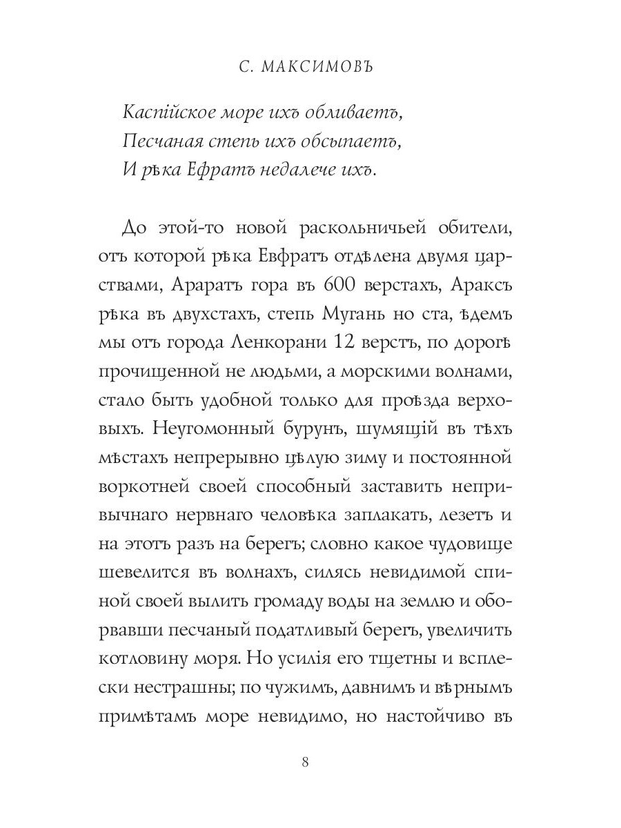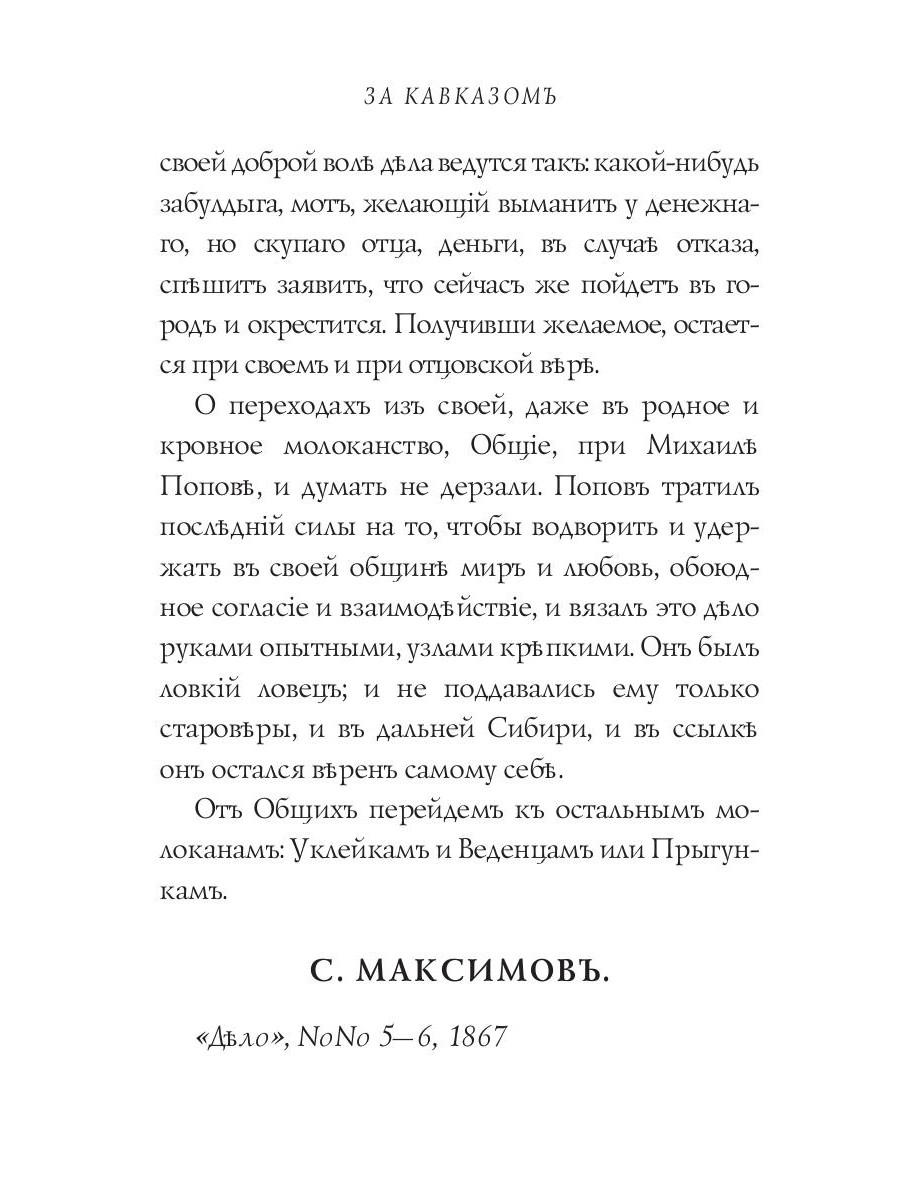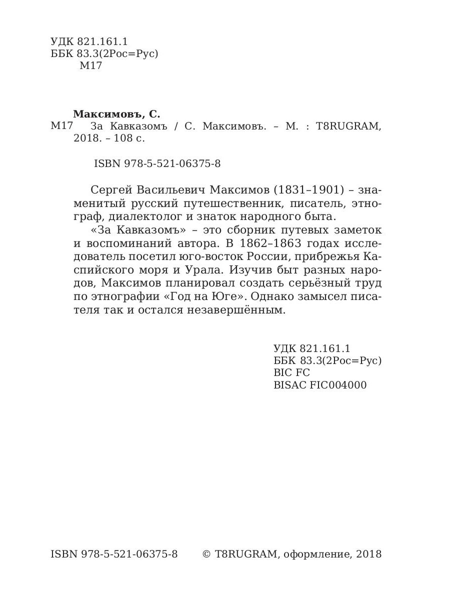 «За Кавказомъ» - это сборник путевых заметок и воспоминаний автора. В 1862-1863 годах исследователь посетил юго-восток России, прибрежья Каспийского моря и Урала. Изучив быт разных народов, Максимов планировал создать серьёзный труд по этнографии «Год на Юге». Однако замысел писателя так и остался незавершённым.