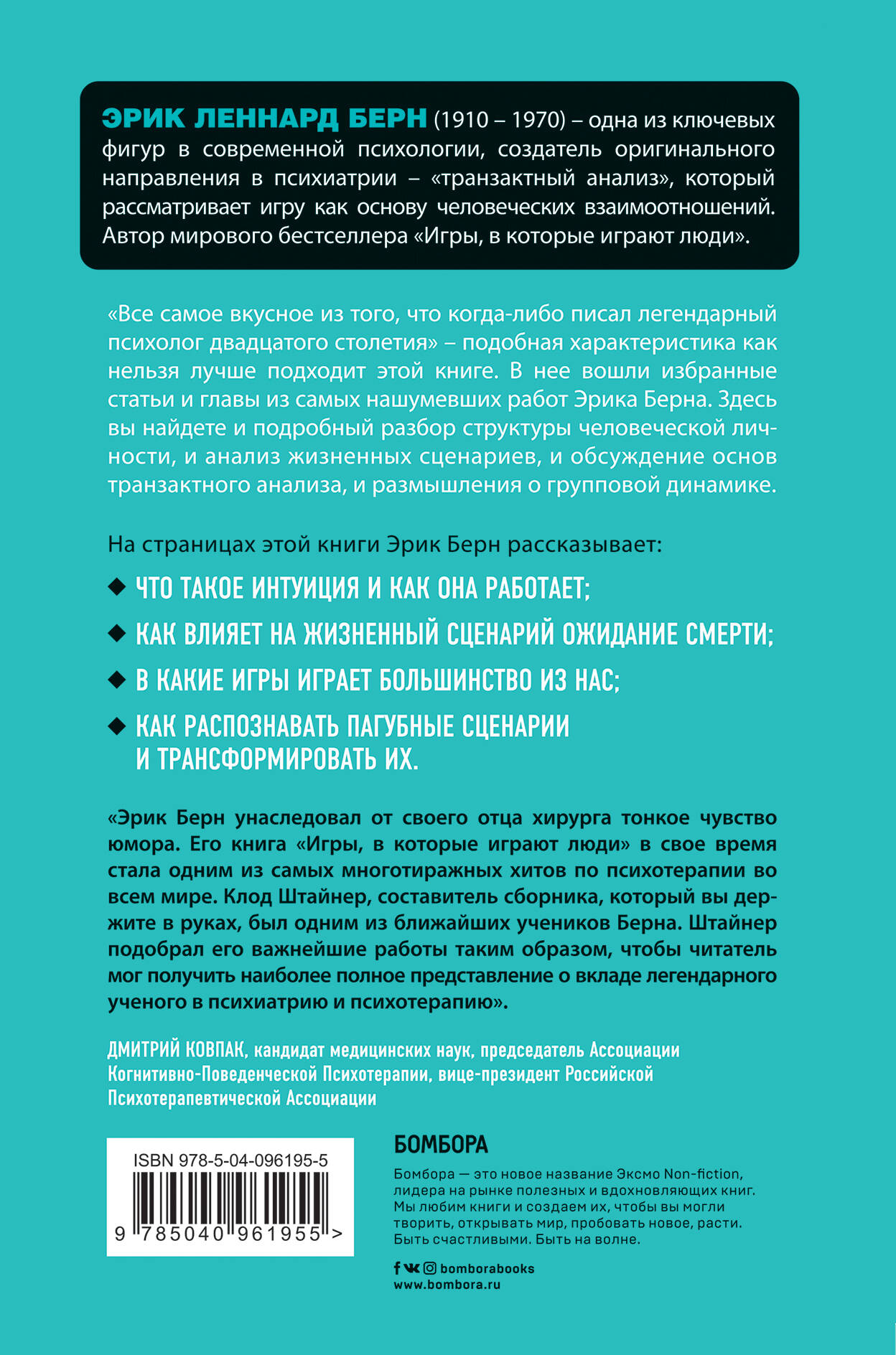 Все, что стоит прочитать у легендарного психолога 20-го столетия, собрано на страницах этой книги. Верный ученик и соратник Эрика Берна Клод Штайнер включил в нее самые яркие и значимые тексты автора мирового лонгселлера «Игры, в которые играют люди». Здесь вы найдете и подробный разбор структуры человеческой личности, и рассмотрение жизненных сценариев, и обсуждение основ транзактного анализа, и размышления о групповой динамике. На страницах этой книги Эрик Берн с присущим ему юмором рассказывает: - что такое интуиция и как она работает; - как влияет на жизненный сценарий ожидание смерти; - в какие игры играет большинство из нас и в чем их правила; - как распознавать пагубные сценарии и трансформировать их.| Издательство | ООО "Издательство "Эксмо" |