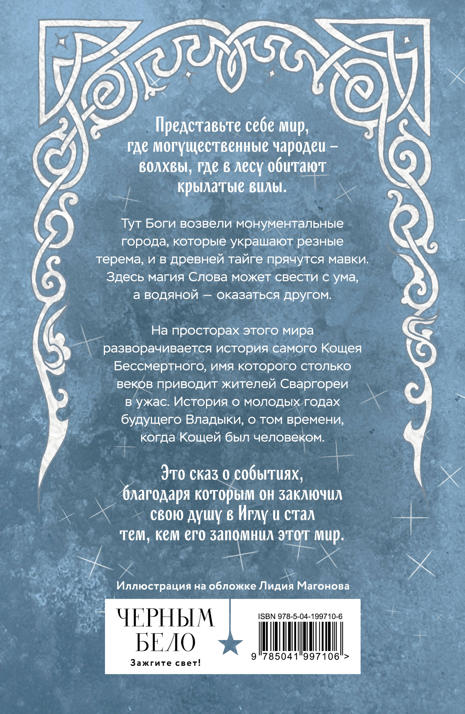 Представьте себе мир, где могущественные чародеи - волхвы, где в лесу обитают крылатые вилы. Тут Боги возвели монументальные города, которые украшают резные терема, и в древней тайге прячутся мавки. Здесь магия Слова может свести с ума, а водяной - оказаться другом. На просторах этого мира разворачивается история самого Кощея Бессмертного, имя которого столько веков приводит жителей Сваргореи в ужас. История о молодых годах будущего Владыки, о том времени, когда Кощей был человеком. Это сказ о событиях, благодаря которым он заключил свою душу в Иглу и стал тем, кем его запомнил этот мир. Иллюстрированное фэнтези, основанное на славянской мифологии, в новом удобном формате покета! Первая книга трилогии, история которой оживает на страницах в иллюстрациях автора.Сказ о Кощее Бессмертном, который раньше был обычным человеком. Историю по достоинству оценил Роман Папсуев, автор проекта «Сказки Старой Руси». Атмосферное оформление текста от автора и обложка от Лидии Магоновой.| Издательство | ООО "Издательство "Эксмо" |