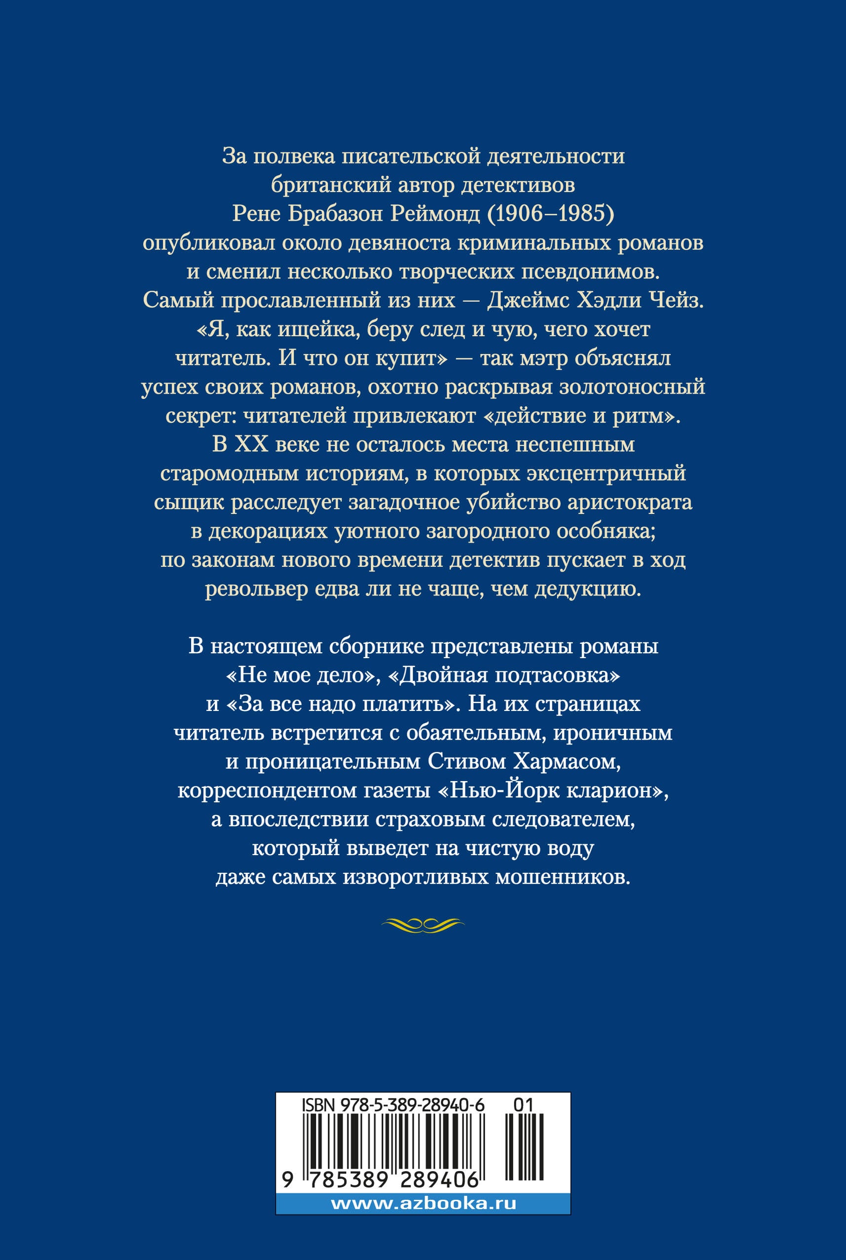 Джеймс Хэдли Чейз известен во всем мире как непревзойденный мастер захватывающего сюжета и классик детективного жанра, а также тонкий знаток человеческих душ. За полвека писательской деятельности он создал порядка 90 романов, которые переведены на десятки языков, и многие из них с успехом экранизированы. В настоящем сборнике представлены романы «Не мое дело», «Двойная подтасовка» и «За все надо платить». На их страницах читатель встретится с обаятельным, ироничным и проницательным Стивом Хармасом, корреспондентом газеты «Нью-Йорк кларион», а впоследствии страховым следователем, который выведет на чистую воду даже самых изворотливых мошенников. Сборник романов Джеймса Хэдли Чейза «За все надо платить» публикуется в новом оформлении. Для всех любителей детективного жанра.