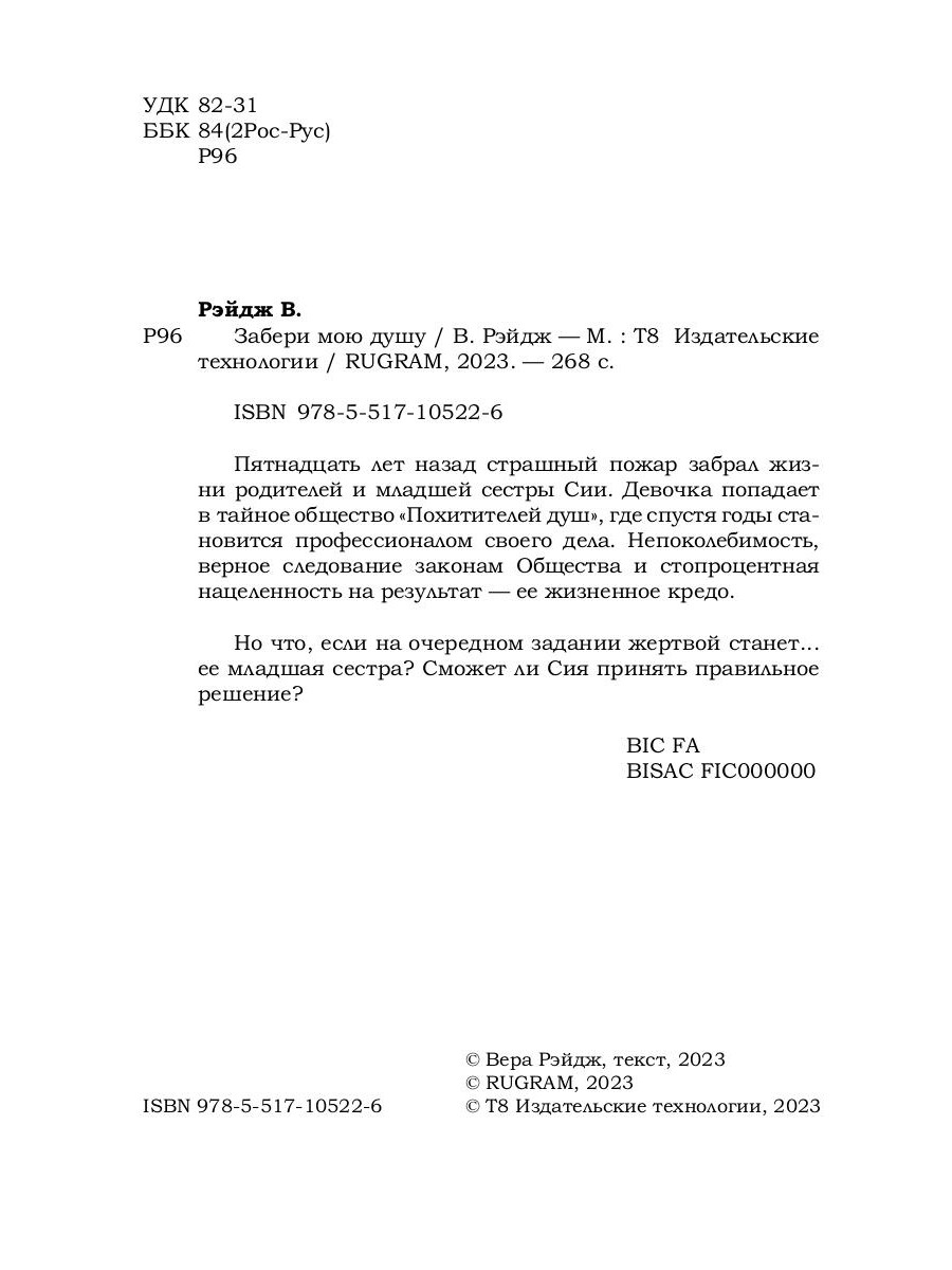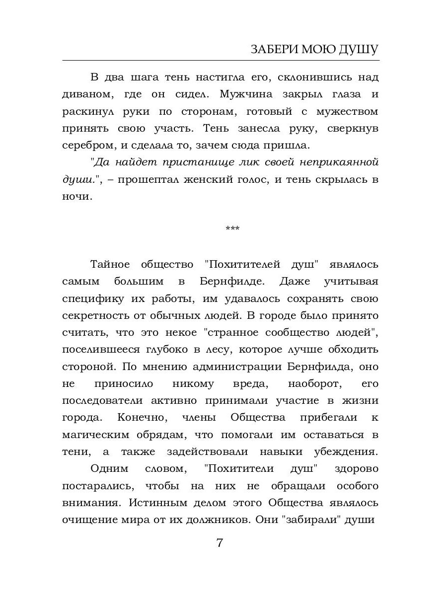 Пятнадцать лет назад страшный пожар забрал жизни родителей и младшей сестры Сии. Девочка попадает в тайное общество "Похитителей душ", где спустя годы становится профессионалом своего дела. Непоколебимость, верное следование законам Общества и стопроцентная нацеленность на результат - ее жизненное кредо. Но что, если на очередном задании жертвой станет... ее младшая сестра? Сможет ли Сия принять правильное решение?| Издательство | Т8 RUGRAM |