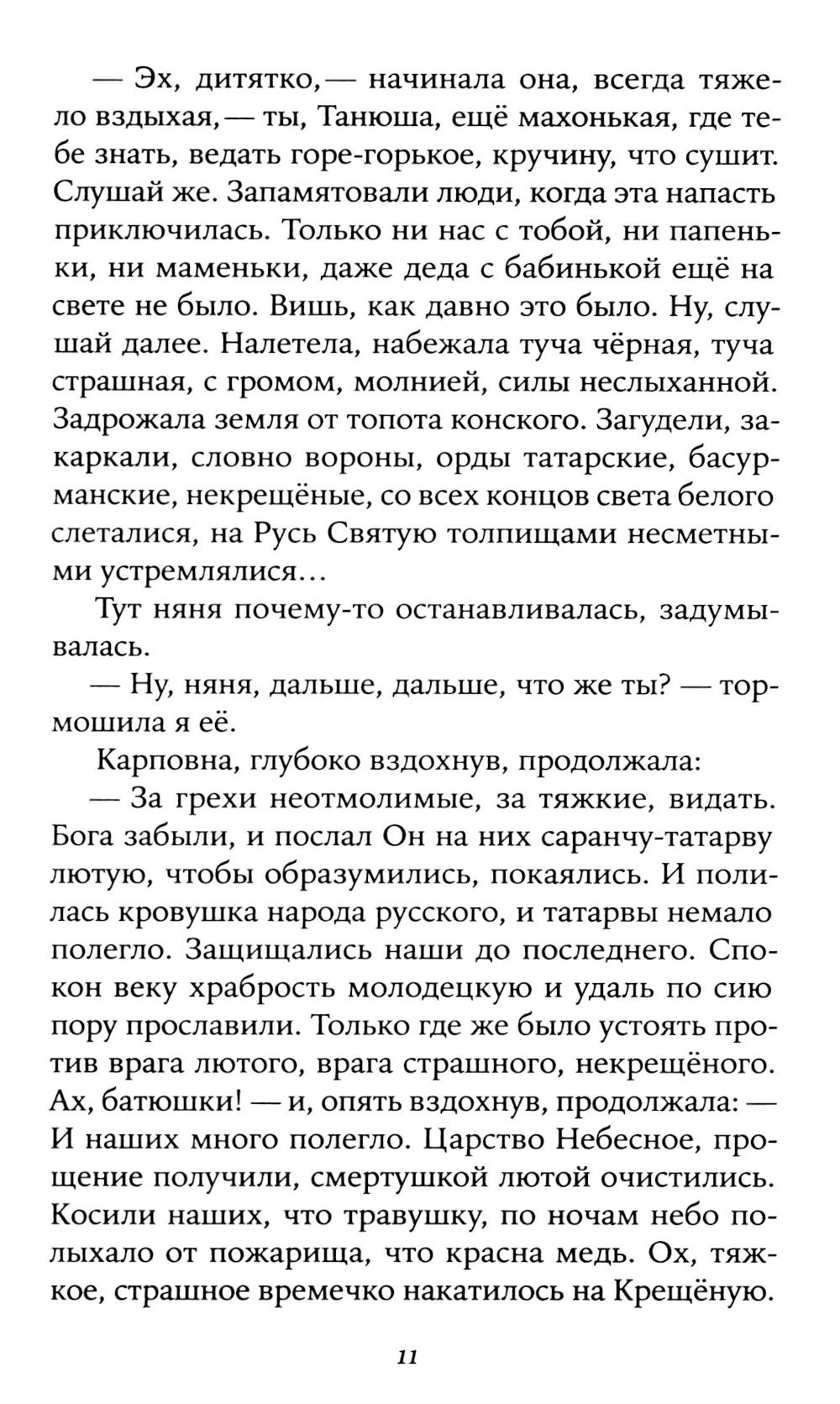 Об ушедшей матушке России и Москве рубежа XIX-XX веков эта книга. Но рисует она не привычную нам бунтарскую и революционную эпоху, а крепкую своими православными устоями, истинно народную и многогранную русскую старину. И ещё в книге - о даре умного сердца: умении любить близких радуя, а не раня. Эту непростую истину выстрадала главная героиня романа - Татьяна, под именем которой выступает уехавшая в эмиграцию писательница Маргарита Викторовна Имшенецкая. Живым, ярким языком книга повествует о русской жизни до революции и судьбе героини, в которой угадывается сама Маргарита Имшенецкая, и о постигших страну бедствиях после 1917 года.| Издательство | Прав.изд."Апостол веры" |