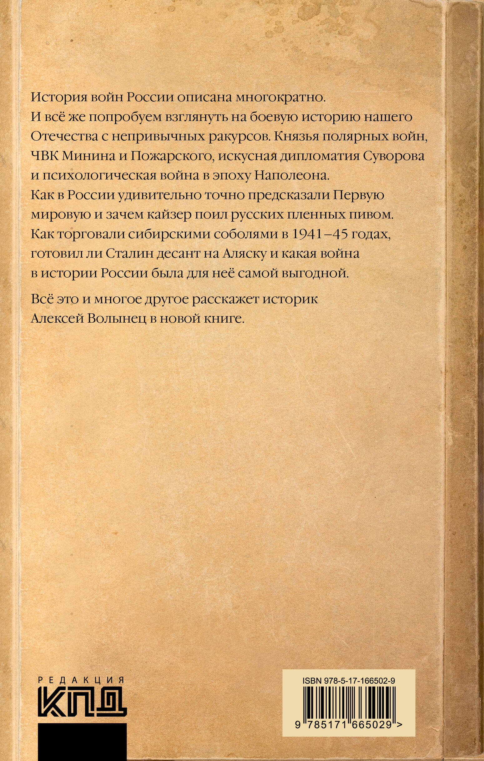 История войн России описана многократно. И всё же попробуем взглянуть на боевую историю нашего Отечества с непривычных ракурсов. Князья полярных войн, ЧВК Минина и Пожарского, искусная дипломатия Суво- рова и психологическая война в эпоху Наполеона. Как в России удивительно точно предсказали Первую миро- вую и зачем кайзер поил русских пленных пивом. Как тор- говали сибирскими соболями в 1941-1945 годах, готовил ли Сталин десант на Аляску и какая война в истории Рос- сии была для неё самой выгодной. Всё это и много другое расскажет историк Алексей Волынец в новой книге.| Издательство | Издательство "АСТ" |
