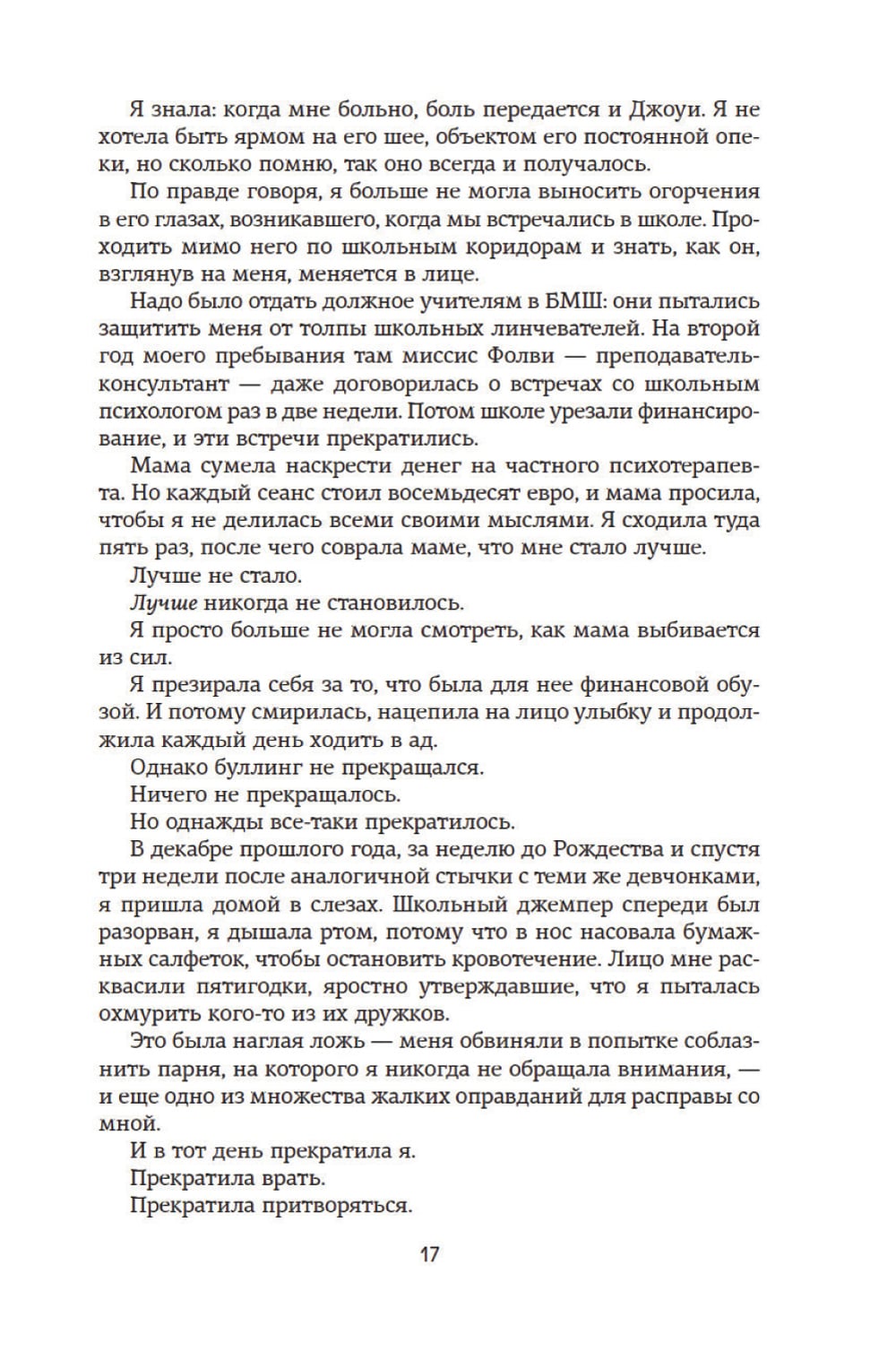 Ее жизнь - борьба. Борьба за каждую спокойную минуту без насмешек и издевательств. Его жизнь - борьба. Борьба с соперниками на поле и с болью, о которой никто не должен знать. На первый взгляд, Шаннон и Джонни настолько разные, насколько вообще можно себе представить. Жертва школьного буллинга и домашнего насилия, Шаннон никогда не чувствует себя в безопасности и хочет только одного - стать невидимкой. Перспективный спортсмен и любимый сын обеспеченных родителей, Джонни пользуется в школе особыми привилегиями и привык ко всеобщему вниманию и восхищению. Их дороги никогда бы не пересеклись, если бы не несчастный случай. А может, наоборот - счастливый?..| Издательство | Азбука |