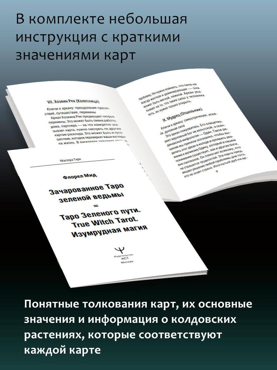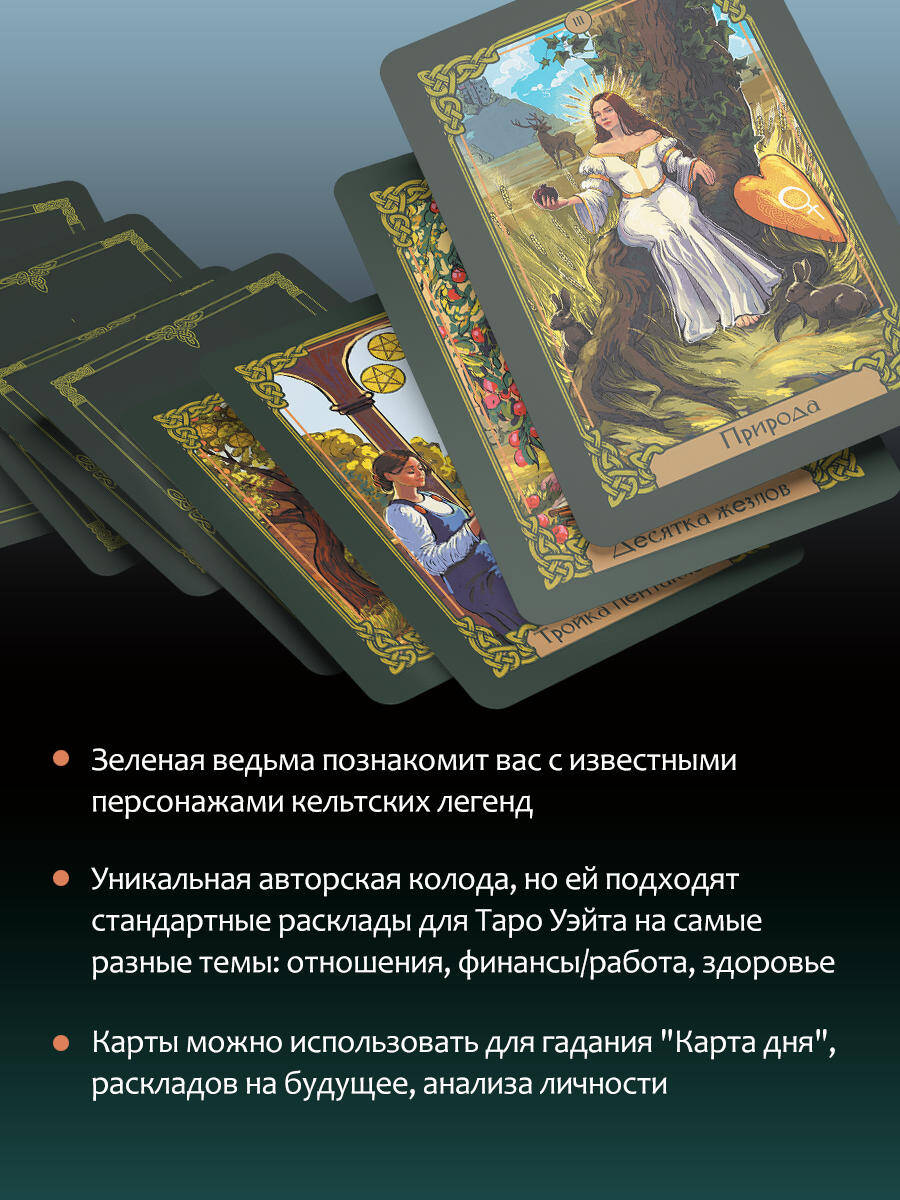 Таро зеленой ведьмы - магическая колода, которая содержит в себе мощную силу Природы и ее мудрость. Каждой карте соответствует конкретное растение, которое дополняет его символику и глубже раскрывает значение карты. В этой колоде вас встретят известные персонажи кельтских легенд: короли и королевы былых времен, фэйри, шелки, лепреконы и другие волшебные существа, которые защитят в процессе гадания, помогут усилить связь и приблизить желаемый исход событий. Неважно, занимаетесь вы зеленой магией или нет, эти карты дадут вам погрузиться в мир растений, мифов и легенд - полный чудес и ответов на ваши вопросы. Это колода, которая не только дает точные ответы, но и рассказывает историю, одаряя вас энергией тепла и света. Она как отражение самой Матушки-Природы. Разложите карты и найдите ответ на свой вопрос - даже на тот, который так страшно задать. Колоде подходят стандартные расклады для Таро Уэйта на самые разные темы: отношения, финансы/работа, здоровье. Можно использовать ее для гадания "Карта дня", раскладов на будущее, анализа личности. В колоде 78 карт и инструкция, они упакованы в качественную коробку под размер карт.| Издательство | Издательство "АСТ" |