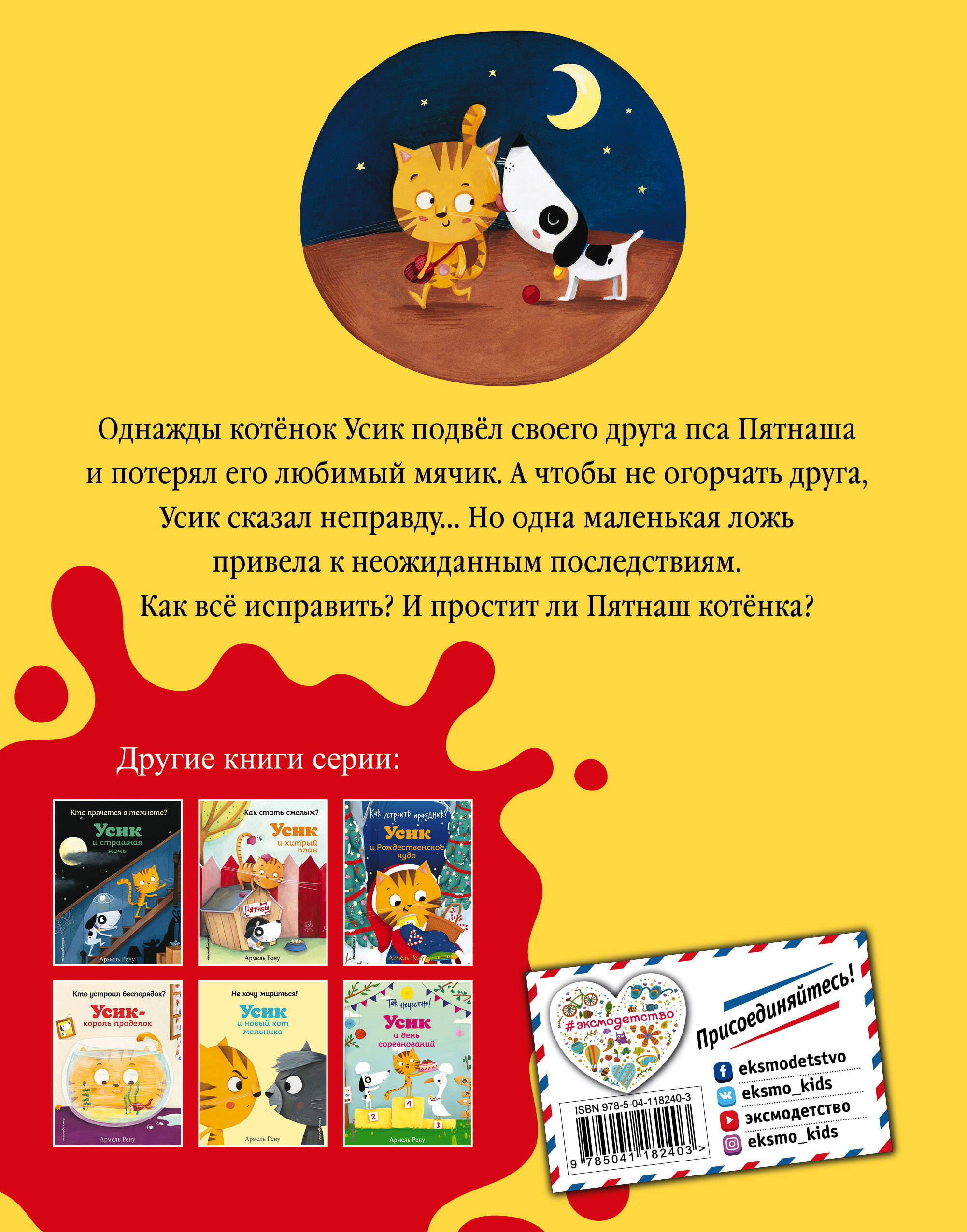 Друзья должны быть честными друг с другом. Котенок Усик и пёсик Пятнаш попадают в ситуацию, когда ложь может испортить отношения. История о том, как один маленький мячик и одна маленькая ложь приведут к неожиданным последствиям. Котенок Усик станет любимым героем вашего малыша на целых семь книг серии! Этот проказник знает, как развеселить друга, придумывает хитрые планы и отправляется в путешествие к новым друзьям. С ним нескучно и приятно провести вечер, слушая мамино чтение, или даже прочитать небольшие истории самому!| Издательство | ООО "Издательство "Эксмо" |