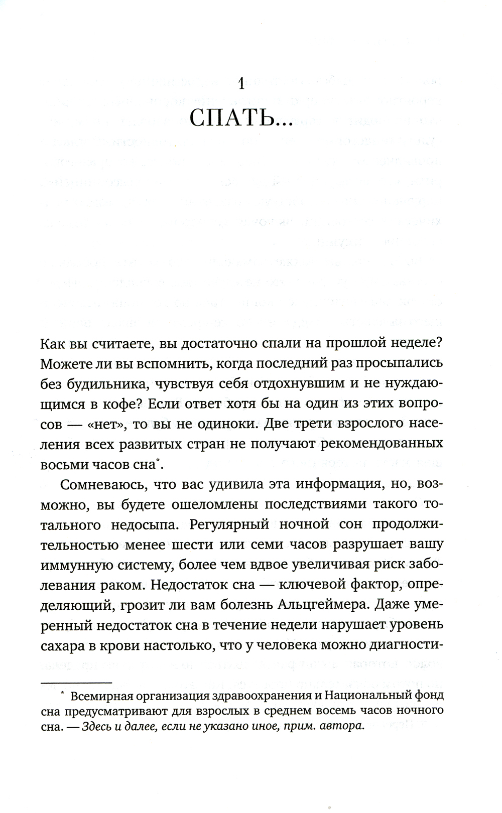 До недавних пор у науки не было полного представления о механизмах сна, о всем многообразии его благотворного влияния и о том, почему последствия хронического недосыпания пагубны для здоровья. Выдающийся невролог и ученый Мэттью Уолкер обобщает данные последних исследований феномена сна и приглашает к разговору на темы, связанные с одним из важнейших аспектов нашего существования. «Сон - это единственное и наиболее эффективное действие, которое мы можем предпринять, чтобы каждый день регулировать работу нашего мозга и тела. Это лучшее оружие матушки-природы в противостоянии смерти. К сожалению, реальные доказательства, разъясняющие все опасности, которым подвергаются человек и общество в случае недосыпания, до сих пор не были в полной мере донесены до людей. Это самое вопиющее упущение в сегодняшних разговорах о здоровье. Исправить его как раз и призвана моя книга, и я очень надеюсь, что она превратится для читателя в увлекательное путешествие, полное открытий. Кроме того, книга нацелена на пересмотр оценки сна и изменение пренебрежительного отношения к нему». (Мэттью Уолкер)| Издательство | КоЛибри |