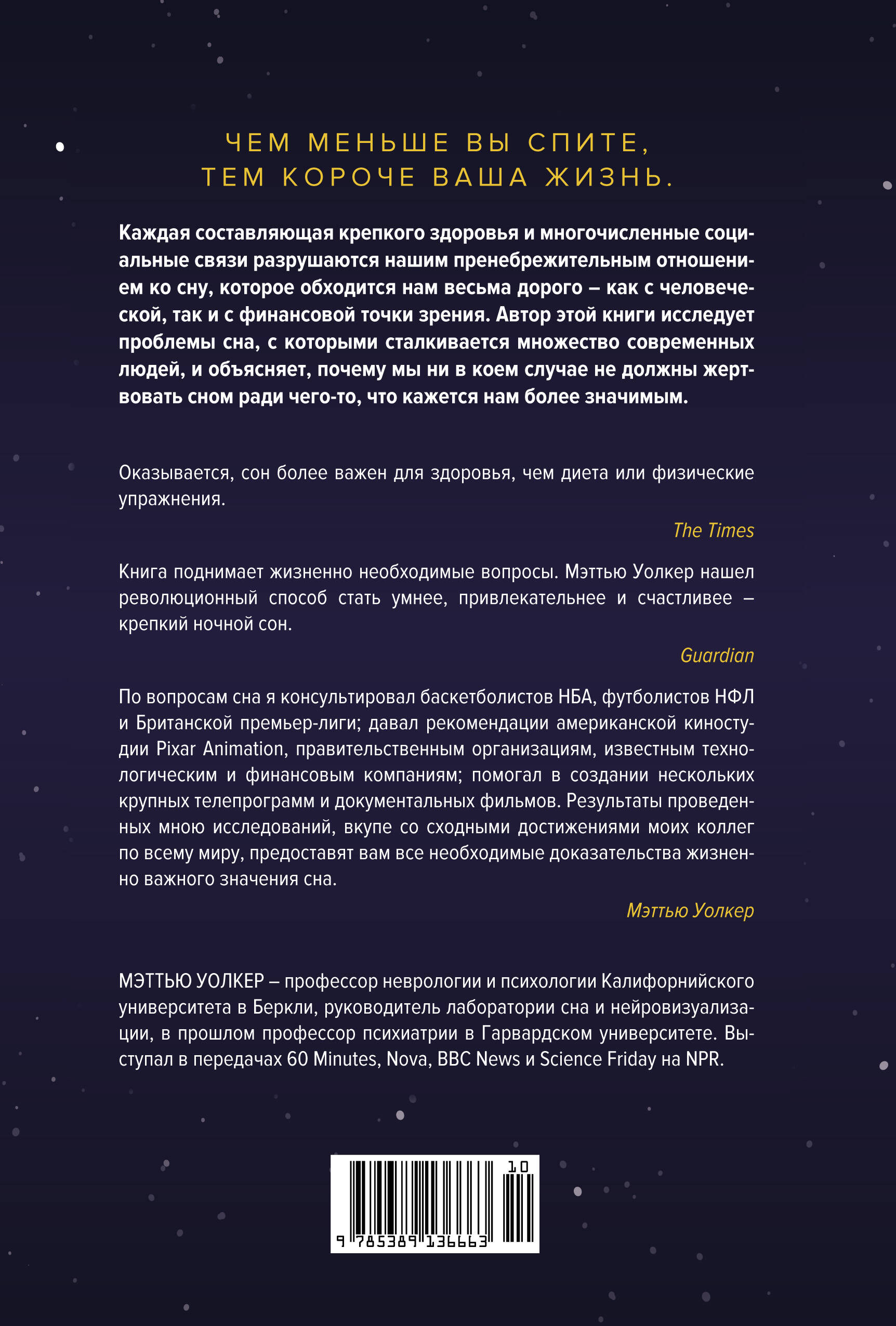 Каждая составляющая крепкого здоровья и многочисленные социальные связи разрушаются нашим пренебрежительным отношением ко сну, которое обходится нам весьма дорого - как с человеческой, так и с финансовой точки зрения. Невролог Мэттью Уолкер исследует проблемы сна, с которыми сталкивается множество современных людей, и объясняет, почему мы ни в коем случае не должны жертвовать сном ради чего-то, что кажется нам более значимым. Книга "Зачем мы спим" дает представление о механизмах сна его благотворном влиянии, а также рассказывает, почему последствия хронического недосыпания пагубны для здоровья.| Издательство | Азбука-Аттикус Издат.группа ООО |