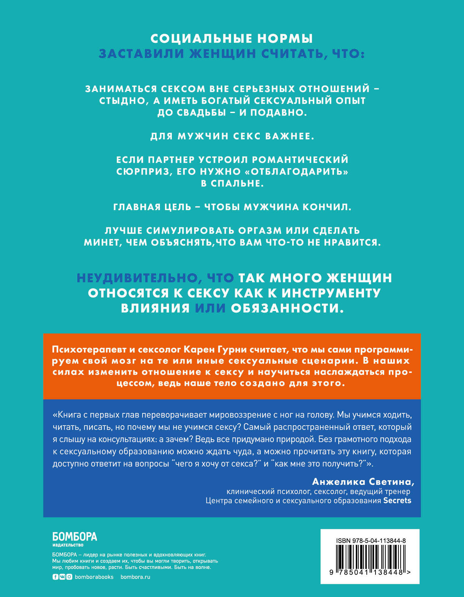 Как вы отреагируете, если узнаете, что все, чему вы привыкли верить относительно вашей сексуальности, - неправда? Что те стандарты, на которые вы ориентируетесь в сексуальной жизни и которым, как вам кажется, не соответствуете, недостижимы для большинства из нас? Секс - одна из областей знаний, в которой глубокие заблуждения преобладали на протяжении долгого времени. Например, мы верим, что желание заниматься любовью возникает само собой. А если его нет, «мы просто друг другу не подходим». Хороший секс нужно «выращивать», а чтобы его вырастить, нам следует понять, как работает наше собственное желание и какие навыки для улучшения сексуальной жизни нужно развивать. Основная тема этой книги - разрыв между представлениями о том, какой должна быть наша сексуальная жизнь (а они часто основаны на некорректных сравнениях), и тем, какова она в действительности. Карен Гурни, психотерапевт и сексолог, сделала большое исследование, где затрагивает тему не(равенства) полов (а оно сильно влияет на сексуальную жизнь) и разницы в оргазме (женщины, особенно гетеросексуальные, часто получают меньше удовольствия от полового акта, чем мужчины, с которыми у них происходит секс). Книга поможет вам преодолеть жесткие установки, сформированные не одним поколением, а упражнения внутри - справиться с различными проблемами, самой и вместе с партнером. Карен Гурни даст вам новое представление о том, что такое «норма». Вы поймете, что хороший секс - это не отсутствие проблем. Хороший секс на протяжении всей жизни - это готовность слушать себя и партнера, возможность обсуждать ваши желания и не бояться пробовать и менять свою сексуальную жизнь к лучшему.| Издательство | ООО "Издательство "Эксмо" |