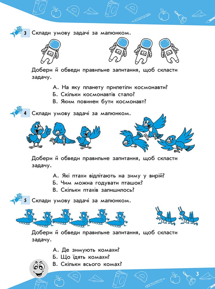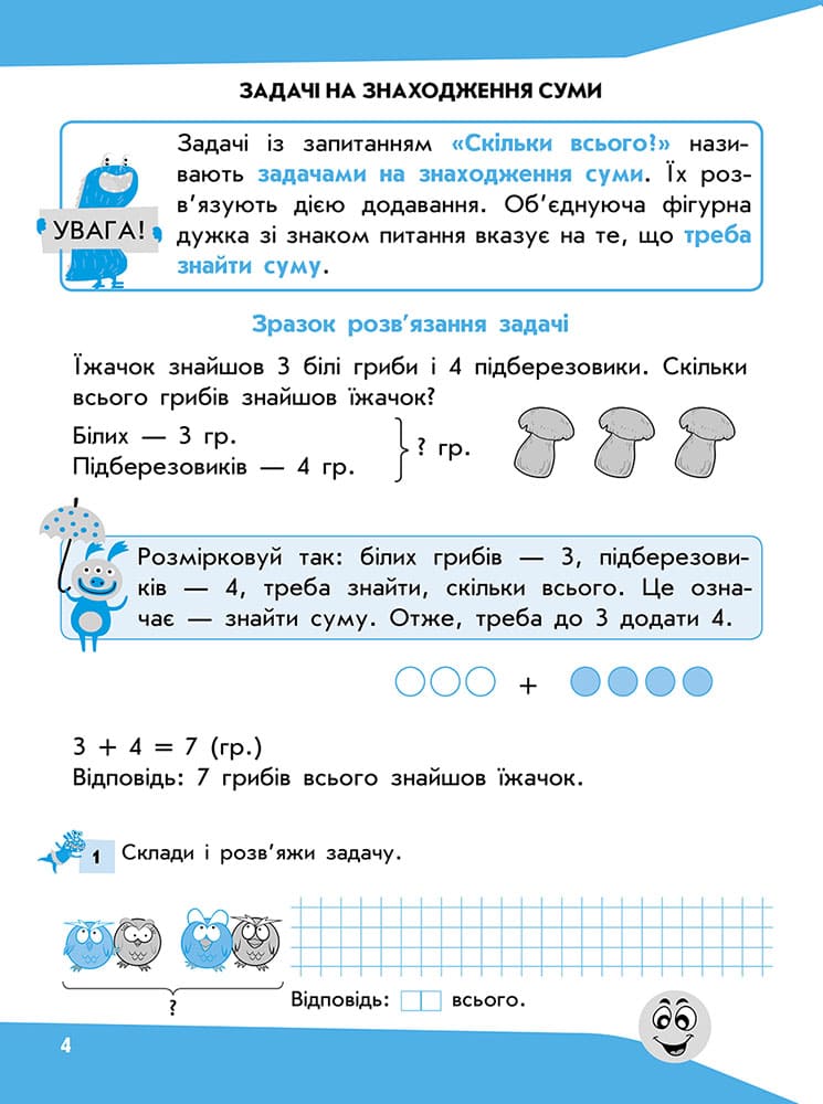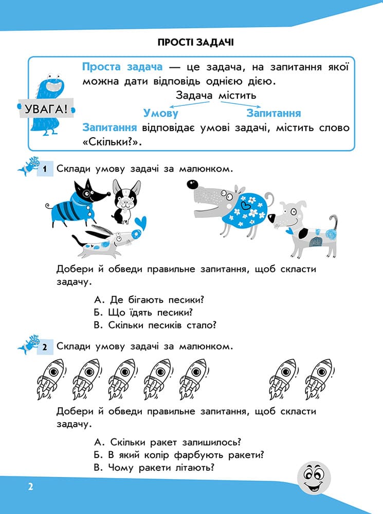 ВІДПОВІДАЄ КОНЦЕПЦІЇ НОВОЇ УКРАЇНСЬКОЇ ШКОЛИ. Посібник має чітку та оригінальну структуру. Завдання зошита відповідають державним вимогам рівня загальноосвітньої підготовки учнів і допомагають розвинути навички: - розв'язання задач різних видів; - складання задач за рисунком, схемою; - обґрунтування дій, за допомогою яких розв'язується задача; - логічного мислення. Завдання різного рівня складності сприяють диференційній роботі з учнями, а системні перевірочні роботи допомагають здійснювати контроль знань. Приємним доповненням до завдань стануть яскраві наліпки для заохочування учнів. Чому варто почитати?Посібник допоможе молодшим школярам навчитися розв'язувати задачі різних типів, виконувати математичні дії, логічно міркувати. Зошити можна використовувати у поєднанні з будь-яким підручником із математики як основний або додатковий дидактичний матеріал для роботи на уроках та вдома.| Дата выпуска | 0000-00-00 |
