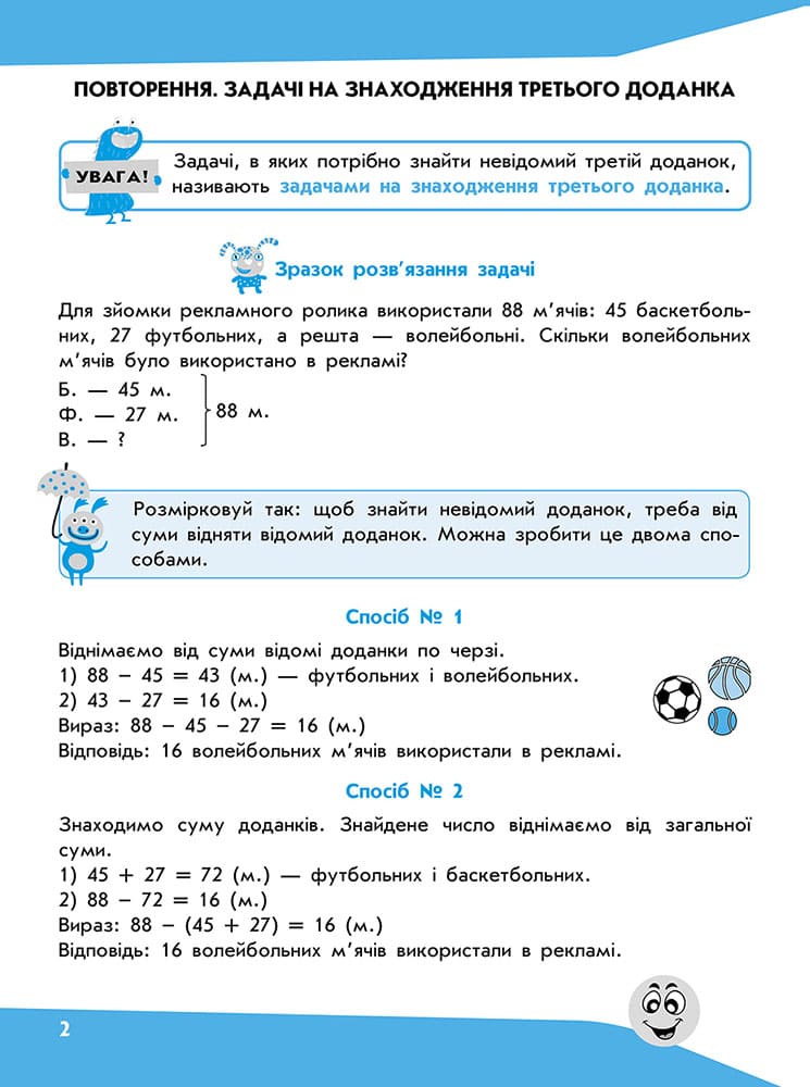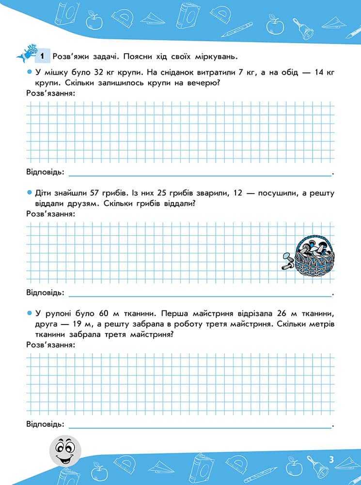 ВІДПОВІДАЄ КОНЦЕПЦІЇ НОВОЇ УКРАЇНСЬКОЇ ШКОЛИ. Посібник має чітку та оригінальну структуру. Завдання зошита відповідають державним вимогам рівня загальноосвітньої підготовки учнів і допомагають розвинути навички: розв'язання задач різних видів; складання задач за рисунком, схемою; обґрунтування дій, за допомогою яких розв'язується задача; логічного мислення. Завдання різного рівня складності сприяють диференційній роботі з учнями, а системні перевірочні роботи допомагають здійснювати контроль знань. Приємним доповненням до завдань стануть яскраві наліпки для заохочування учнів. Чому варто придбати: Посібник допоможе молодшим школярам навчитися розв'язувати задачі різних типів, виконувати математичні дії, логічно міркувати. Зошити можна використовувати у поєднанні з будь-яким підручником із математики як основний або додатковий дидактичний матеріал для роботи на уроках та вдома.| Дата выпуска | 0000-00-00 |