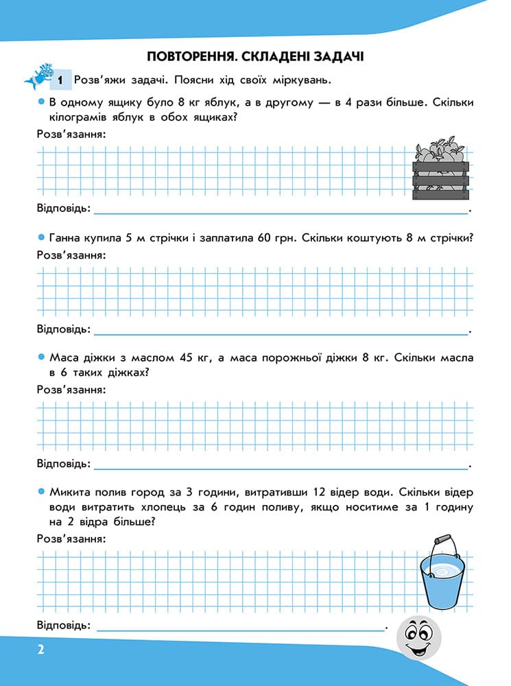 ВІДПОВІДАЄ КОНЦЕПЦІЇ НОВОЇ УКРАЇНСЬКОЇ ШКОЛИ. Посібник має чітку та оригінальну структуру. Завдання зошита відповідають державним вимогам рівня загальноосвітньої підготовки учнів і допомагають розвинути навички: розв'язання задач різних видів; складання задач за рисунком, схемою; обґрунтування дій, за допомогою яких розв'язується задача; логічного мислення. Завдання різного рівня складності сприяють диференційній роботі з учнями, а системні перевірочні роботи допомагають здійснювати контроль знань. Приємним доповненням до завдань стануть яскраві наліпки для заохочування учнів. Чому варто придбати Посібник допоможе молодшим школярам навчитися розв'язувати задачі різних типів, виконувати математичні дії, логічно міркувати. Зошити можна використовувати у поєднанні з будь-яким підручником із математики як основний або додатковий дидактичний матеріал для роботи на уроках та вдома.| Дата выпуска | 0000-00-00 |