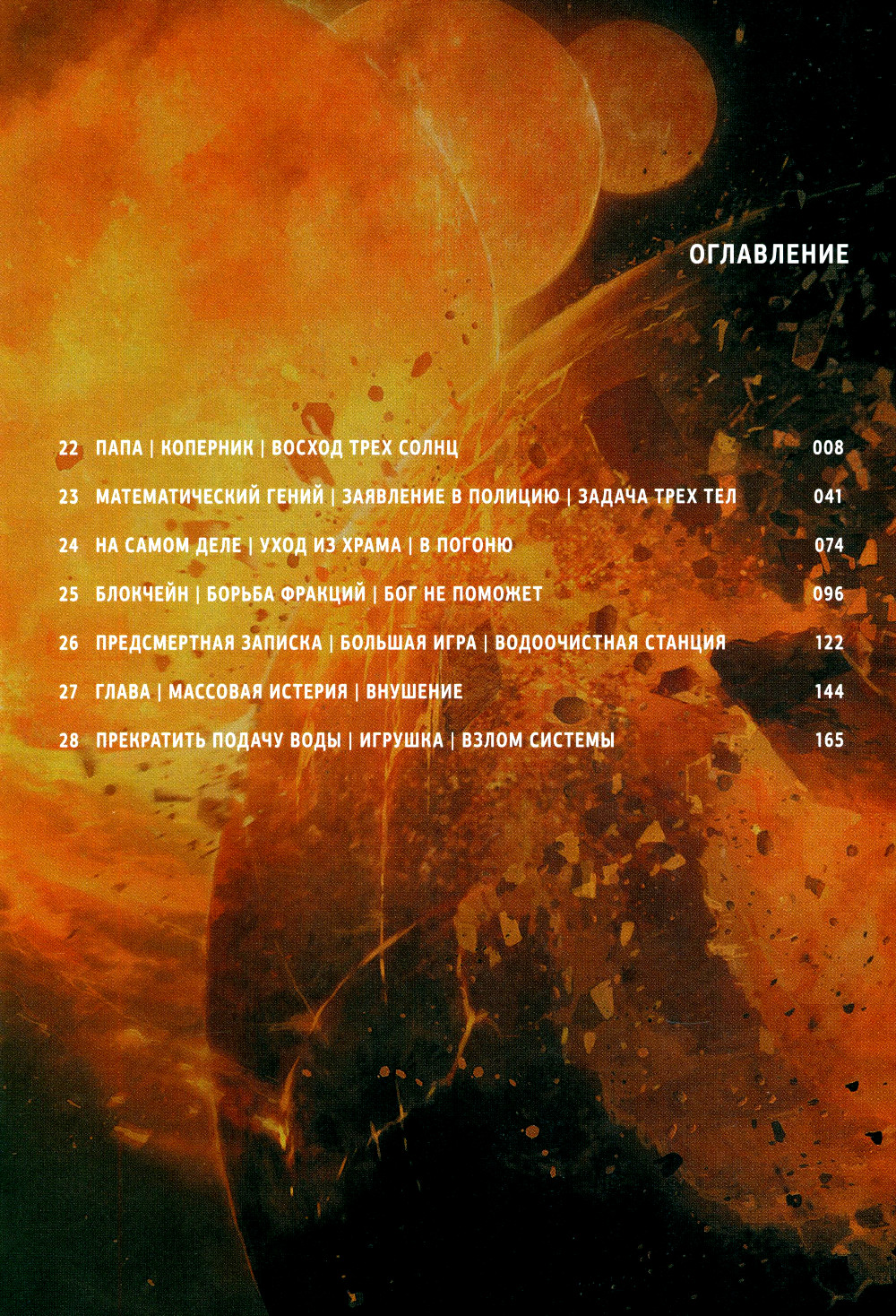 По совету капитана Ши, Ван Мяо возвращается в игру «Три тела». На этот раз он попадает в Средневековую Европу, где, стоя перед папой римским, выдвигает смелую теорию о том, что в мире «Трех тел» существует не одно, а три Солнца. Подобное выступление дорого обходится физику - его приговаривают к казни, после которой вход в игру будет для него закрыт навсегда... Тем временем Вэй Чэн заявляет полиции, что жена расправится с ним, если он не решит задачу трех тел. Капитан Ши, только и ждавший предлога арестовать Шэнь Юйфэй, тут же отправляется к ней в дом, но находит там лишь ее труп...| Издательство | Азбука |