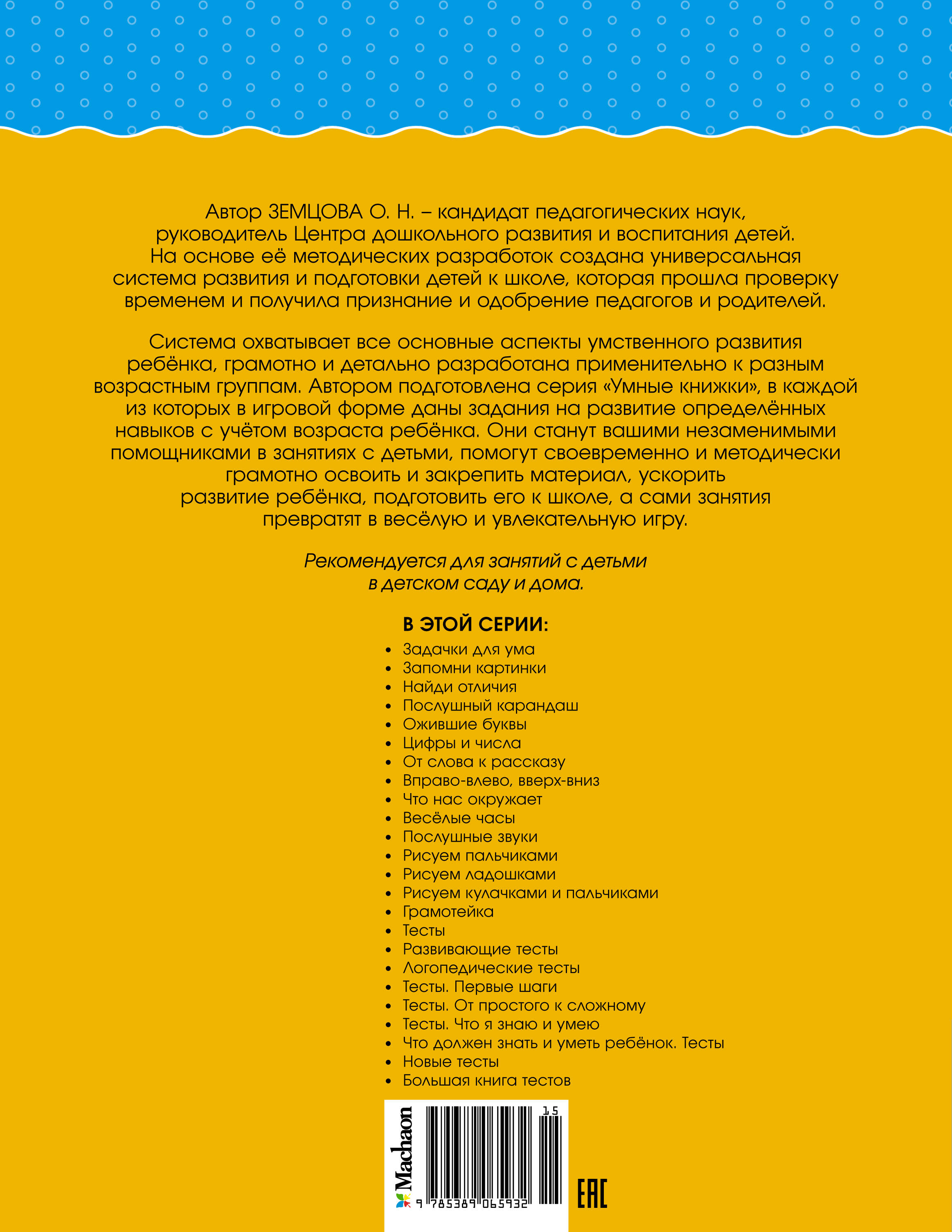 Автор книг этой серии - Земцова Ольга Николаевна, кандидат педагогических наук, руководитель Центра дошкольного развития и воспитания детей. Цель разработанной автором методики - комплексное развитие ребёнка с учётом требований современного дошкольного образования. Методика О.Н. Земцовой формирует у детей не только систему знаний, но и позитивное отношение к учёбе, уверенность в своих силах и нацеленность на результат. В этой серии вы найдёте книги с тестовыми заданиями трёх уровней сложности для разных возрастных групп. Занимаясь по книгам, вы сможете проверить знания вашего ребёнка и узнаете, какие навыки требуют дополнительного развития. Рекомендуется для занятий с детьми в детском саду и дома.| Издательство | Азбука-Аттикус Издат.группа ООО |