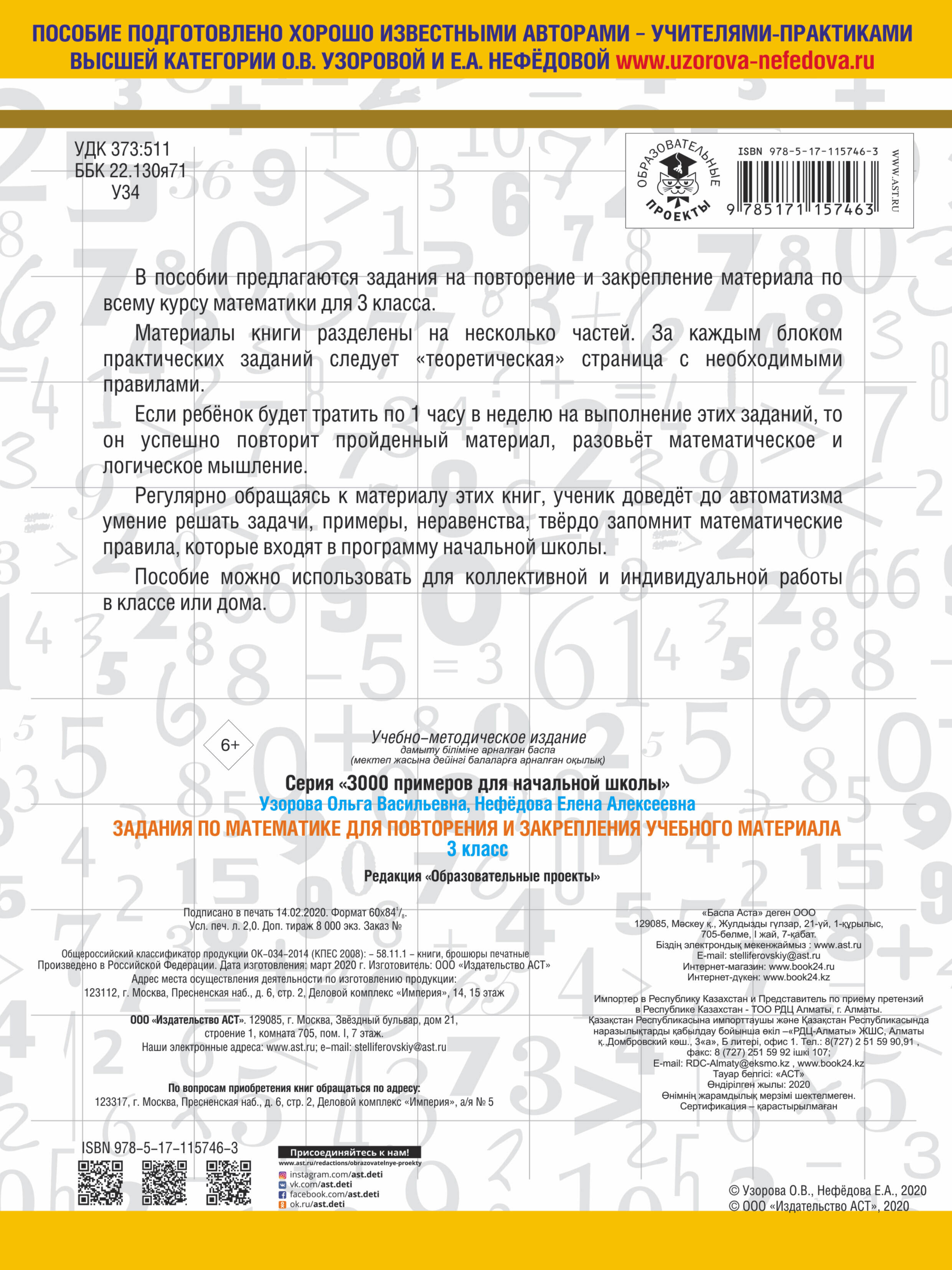 В пособии известных педагогов-практиков, авторов самых издаваемых учебников и учебных пособий в России О.В. Узоровой и Е.А. Нефёдовой предлагаются задания на повторение и закрепление материала по всему курсу математики для 3 класса. За каждым блоком практических заданий следует страница с необходимыми правилами. Регулярно занимаясь по этому пособию, ученик доведёт до автоматизма умение решать задачи, примеры, неравенства, твёрдо запомнит математические правила, которые входят в программу начальной школы. Пособие можно использовать для коллективной и индивидуальной работы в классе или дома.| Издательство | Издательство "АСТ" |