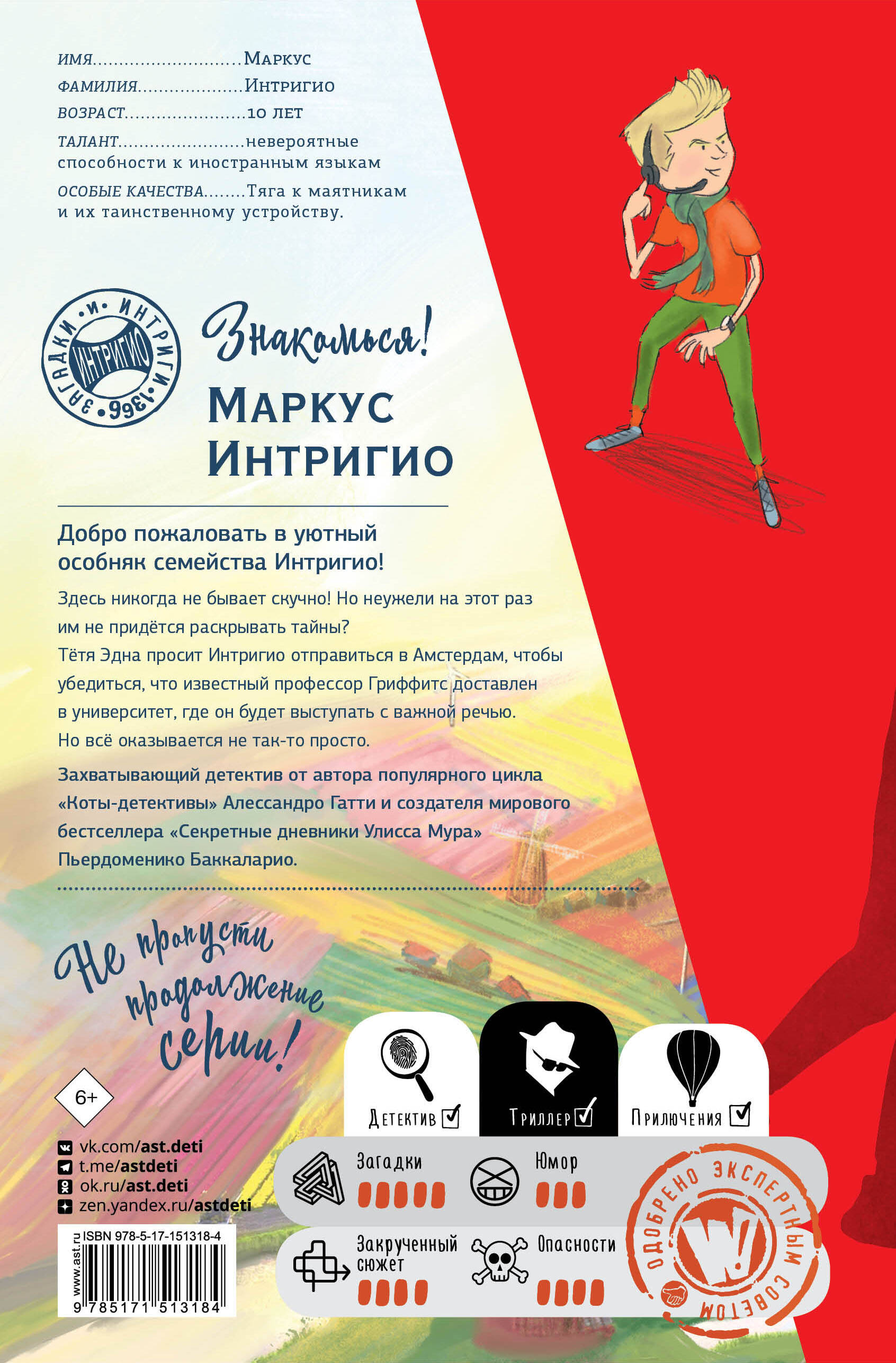 Если однажды вы окажетесь в Амстердаме, то во время прогулки по каналам, возможно, заметите... Хотя, скорее всего, вообще не заметите. Особняк Интригио - это совершенно обычный дом. Но внутри живёт совсем не обычная семья. Вам предстоит познакомиться с семейством Интригио, каждый член которого - первоклассный шпион. Новое захватывающее приключение. На этот раз дело будет касаться проекта "Тройной бриллиант" - программы бурения нефтяных скважин Северного моря. Фантастические перевоплощения, погони и уловки - семейка Интригио сделает всё, чтобы предотвратить экологическую катастрофу. Захватывающий детектив от автора популярного цикла "Коты-детективы" Алессандро Гатти и создателя мирового бестселлера "Секретные дневники Улисса Мура" Пьердоменико Баккаларио.| Издательство | ИЗДАТЕЛЬСТВО "АСТ" |