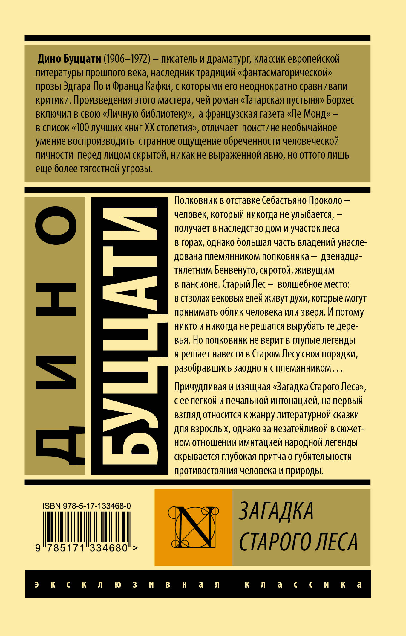 «Загадка Старого Леса» - культовая классика ХХ века от итальянского писателя Дино Буццати. Магический реализм и философская притча сплелись на страницах книги, чтобы каждый смог окунуться в волшебную атмосферу сказочной природы и проникнуться глубоким смыслом бытия.| Издательство | ИЗДАТЕЛЬСТВО "АСТ" |