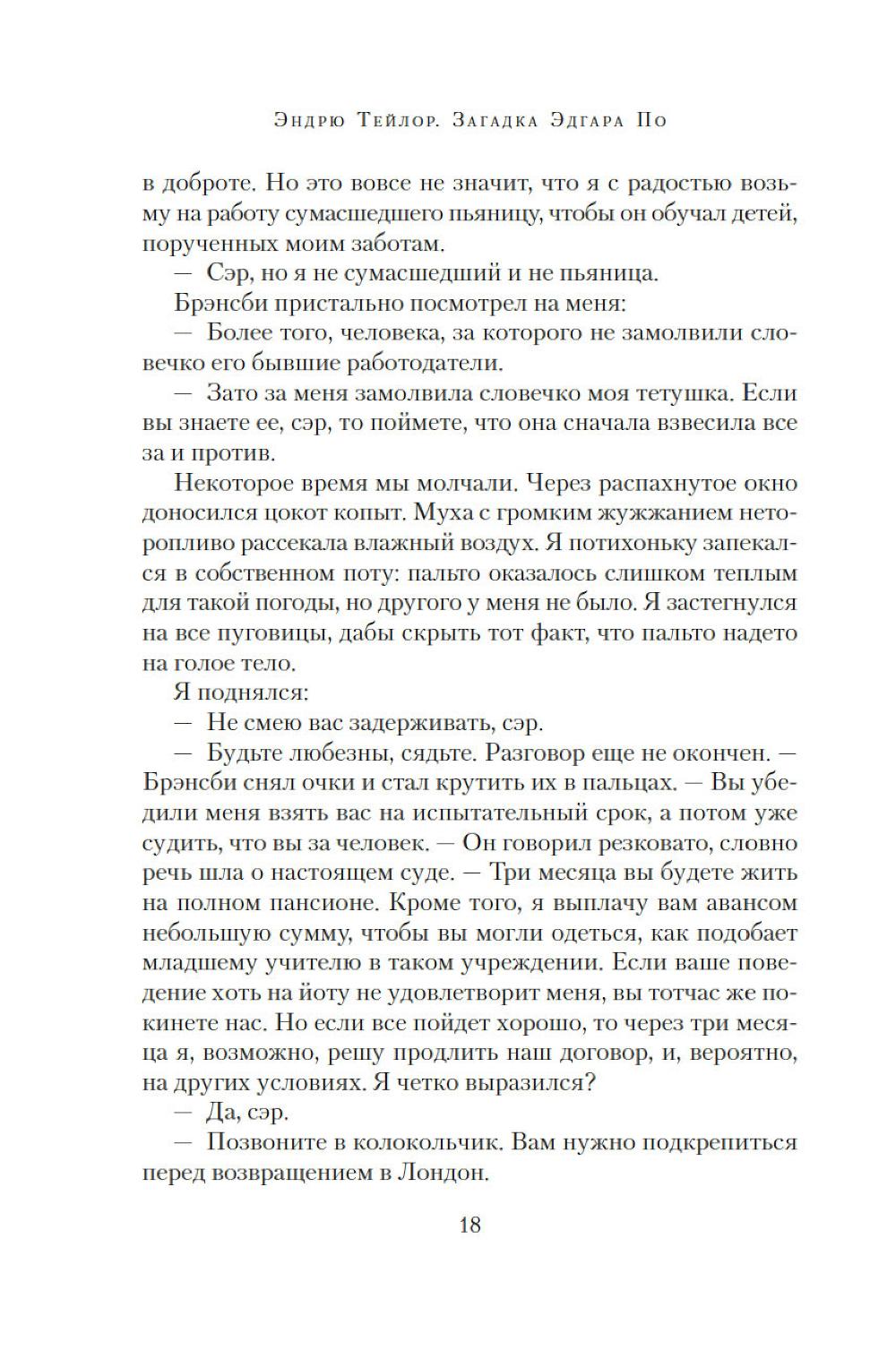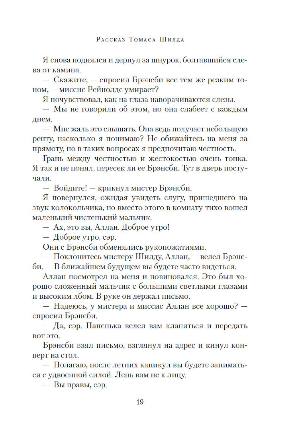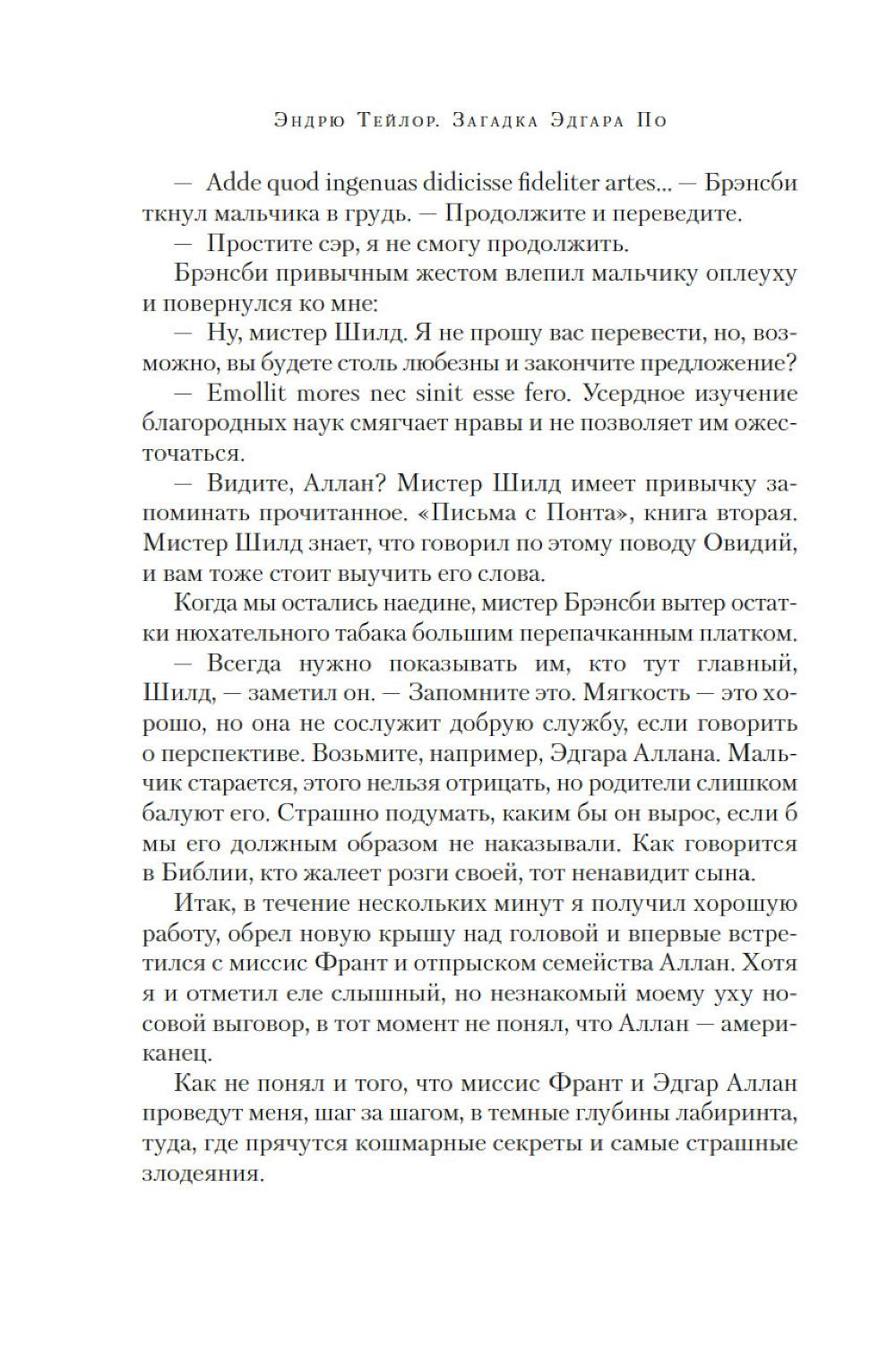 Англия времен Регентства, 1819 год. Вопреки отсутствию рекомендаций Томас Шилд получает место помощника учителя в пригороде Лондона. Среди его учеников - юный американец Эдгар По, приемный сын Алланов, и его лучший друг, избалованный неженка Чарльз Франт. Мальчики удивительно похожи друг на друга... Томас влюбляется в красивую, но не слишком счастливую мать Чарльза и постепенно увязает в паутине чужих семейных тайн и интриг. Когда на задворках столицы находят обезображенный труп, все улики указывают на семью Франт. Поневоле втянутый в эту запутанную историю, Шилд понимает, что у него более чем достаточно причин для беспокойства. А вскоре выясняется, что в центре этих жутких событий фигурирует маленький американец... Книга входит в топ-10 лучших детективных романов десятилетия по версии Sunday Times.